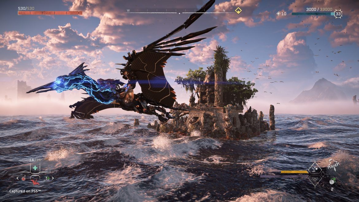 Horizon Forbidden West är – likt sin föregångare – också ett open-world äventyr. Dessa har vi älskat och älskar fortfarande när de görs som Witcher 3, men även det spelet har en del vaddering och tradiga fetch-quests som bara innebär extra speltid i form av nötande, att vara springpojke och bocka av en ”att göra-lista” (här lånar man också inspiration från Witcher 3 med ”maskinknuff”, Forbidden Wests version på kortspelet Gwent). Med åren har vi allt mindre ork och tålamod för ”busy work” (det har vi nog med i vardagen). Horizon 2 lyckas faktiskt skala ned på ”ärendena” och även begränsa områdena det utspelar sig på något, så man slipper helt nedlusade kartor á la Assassin’s Creed: Valhalla (ett jättebra spel, men en mardröm för oss med lite OCD som ”måste” bocka av ”allt”). Priset blir dock att en del områden känns något ”trånga” och designen på plattformsinslagen inte är blir helt även, då det är svårt att ibland hitta och pricka ytor och kanter som Aloy faktiskt kan hoppa till och använda sig av. Här har man mycket att lära av Uncharted-spelen, som bemästrar denna del perfekt. Ruinerna – spelets sidospår för att finna artefakter – är exempel på speldesign och mekanik som inte fungerar lika bra som resten på grund av ovan nämnda tillkortakommanden.