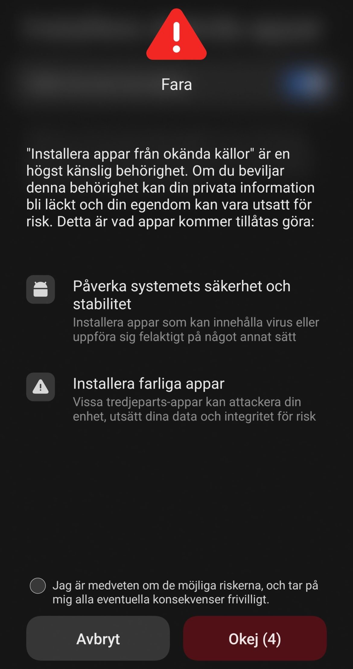 Den här varningen ser lite olika ut på olika telefoner, men i exemplet ovan kom den från en Xiaomi 15 Ultra. Vi går vidare och accepterar riskerna som vi varnas för. Då kommer nästa varning.