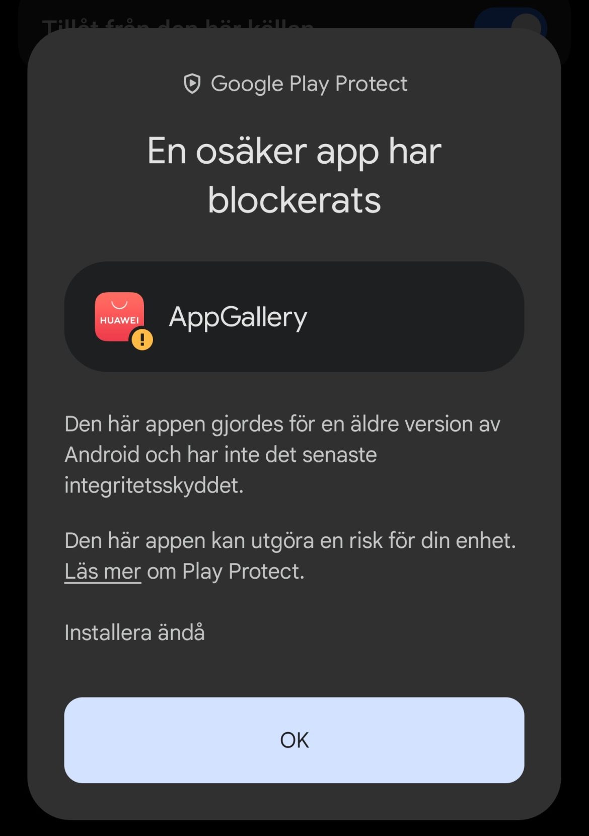Vi testade att göra om installationen på flera olika telefoner, och någon variant av varning kom på samtliga telefoner. Man var tvungen att aktivera ”installera okända appar”. Den enda telefonen där det fungerade helt utan problem var en telefon från Huawei, nämligen Huawei P30 Pro, där AppGallery redan var installerat.