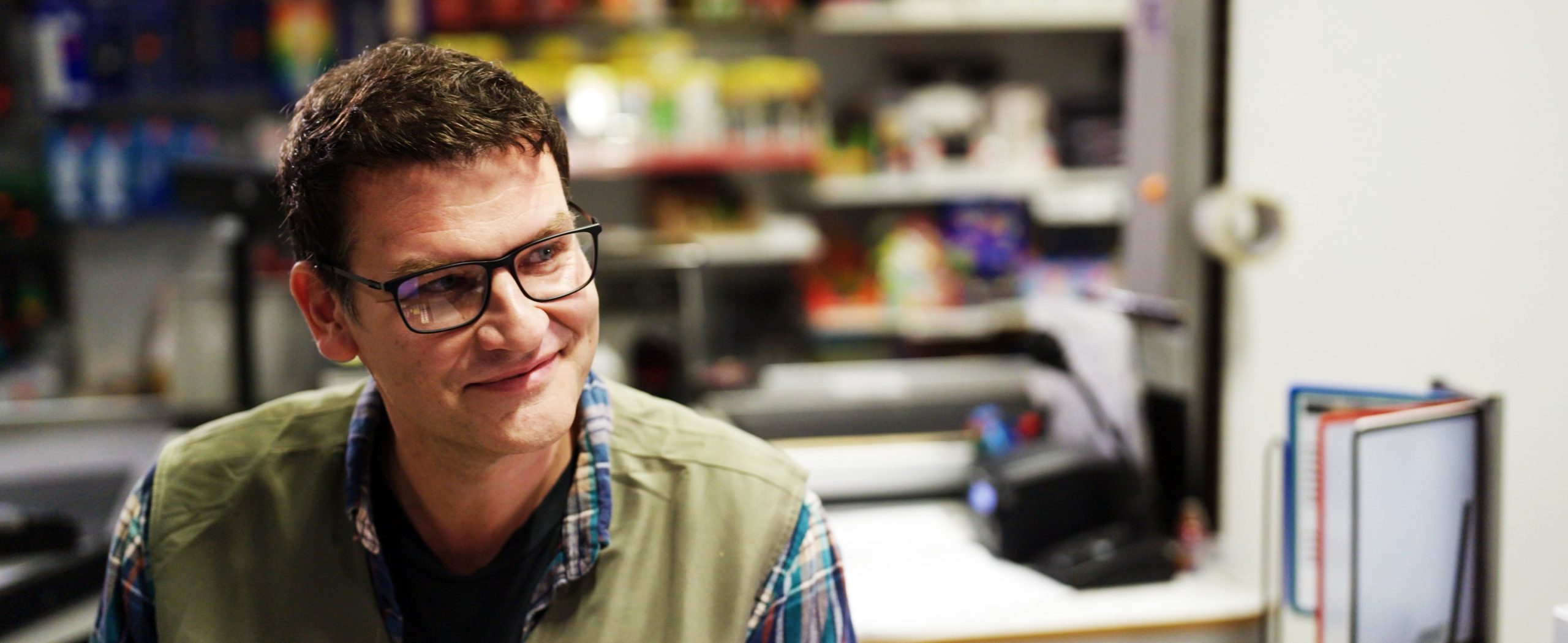 Han hade en underbar inställning och protesterade inte ens när vi ville sätta eld på stuntfolk som skulle springa genom butiken.