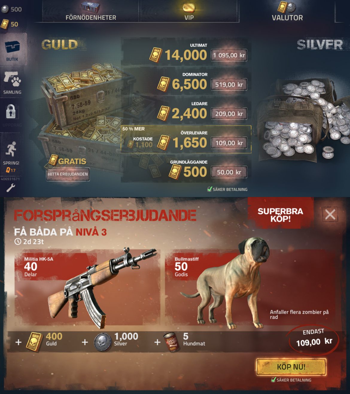 Into The Dead 2 finns son free-to-play-app till din telefon och där är det ganska annorlunda mot Switch-versionen. För då det är ”gratis” bygger det på att du behöver hundmat för att hunden ska följa med. Slut på hundmat? Köp för 109kr. Du behöver energi för att köra en bana till – slut på energi? Köp för 39kr eller vänta i tre timmar. Så håller det på och snabbt avinstallerar jag det från min telefon. Switch-versionen betalar du en engångssumma för spelet och sen finns det inga fler köp inuti som behöver göras, du har alltid hunden med dig, du har alltid en kniv för att rädda dig en gång och du behöver aldrig vänta för att få köra en gång till. Visst kan jag förstå att man vill tjäna pengar på sitt spel men då borde det finnas ett tak på hur många gånger man kan köpa grejer till spelet och därefter är allt gratis. Så är inte fallet med mobilspelet, utan du kan betala i all evighet om du inte orkar att vänta. Det fanns ett Smurf-spel bland annat som en unge köpte Smurfbär för 60.000kr utan att det stoppades (det löste sig ändå till slut för de stackars föräldrarna – men detta är något som borde regleras).