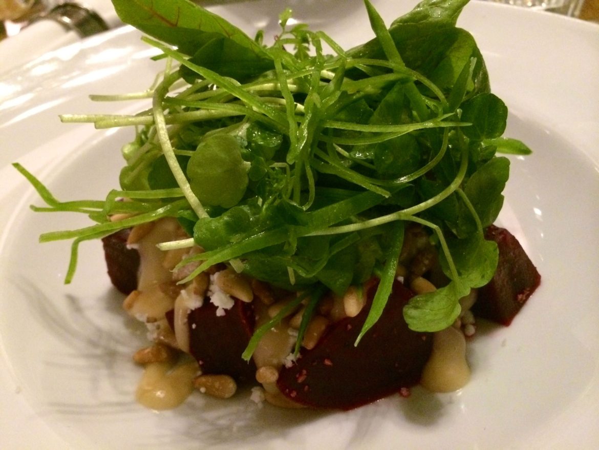Vi följer servitörens rekommendationer och bestämmer oss för Kalv Cordon bleu – grillad kalventrecote med emmentalercréme, lufttorkad skinka, rödvinssås & potatispuree (225kr). Samt Orangeriet – varma rödbetor med getost, pinjenötter, senapsdressing, sockerärtor och örter (169kr). Vi gillar att servitören svarar snabbt och säkert på våra frågor och följer även hans vintips Rioja (115kr/glas) till Cordon Bleu och ett vitt Sancerre (140kr/glas) till Orangeriet.