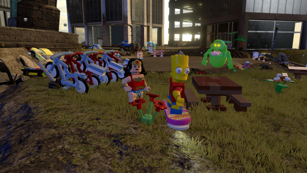 I startpaketet får man en så blandad trio figurer som Gandalf (från Sagan om Ringen, som är utgiven av New Line – ett Warner-bolag), Batman (DC Comics, ägs av WB) och Wildstyle (från LEGO: The Movie). Denna okonventionella trio kan tillsammans uppelva ett äventyr där man transporterats mellan olika dimensioner och LEGO-världar, från Trollkarlen från Oz, till The Simpsons och Scooby-Doo. Givetvis finns här frivilliga utmaningar och sidospår som kräver att du köper fler figurer med speciella krafter (jämför de olika elementen i Skylanders) men dessa kan du även ”hyra” i 30 sekunder för 50,000 LEGO-pengar, en slags kompromiss som känns helt OK faktiskt (även om du måste köpa några figurer till för att hitta alla 480 gyllene LEGO-klossar). Förutom enstaka figurer kan du även köpa fristående äventyr, såsom exempelvis Ghostbusters (som vi berättar mer om nedan).