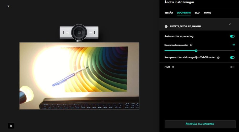 Logitech MX Brios mjukvara gör ett bra jobb för att med hjälp av HDR (High Dynamic Range, kameran tar flera bilder med olika ljusexponering och slår sedan samman dessa.) platta ut ljusförhållanden. Det mest klassiska är när någon sätter sig med ett fönster bakom och ofta blir helt svart för betraktaren. Det är för att kontrasterna blir för stora och kameran minskar det starka ljuset från bakgrunden.