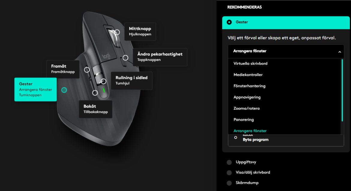 Förutom en hyfsat uttömmande rad av alternativ kan du även välja in kortkommandon som Ctrl+C eller genväg för emojis. Samma princip gäller här som för tangentbordet där du kan välja nästan vad som helst. Det är också i Logi Options+ du ställer in datormusens funktioner i Logi FLOW och Gester.