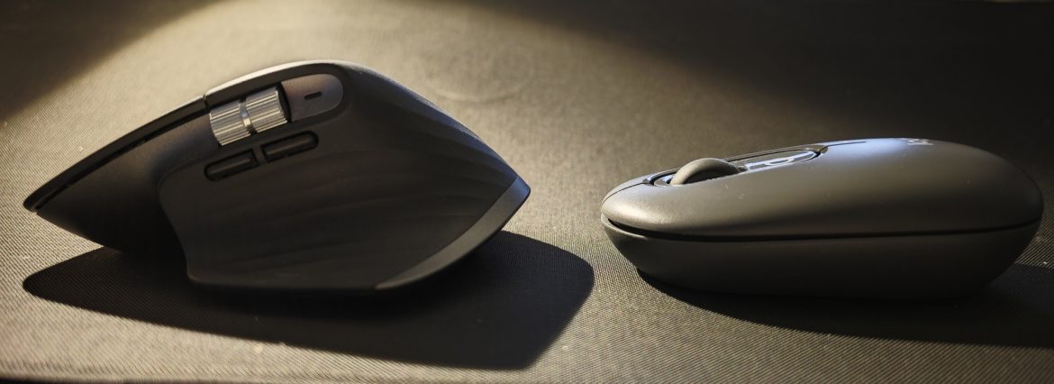 Logitech MX Master 3S till vänster och POP Icon Mouse till höger för visualisera skillnaden i storlek.