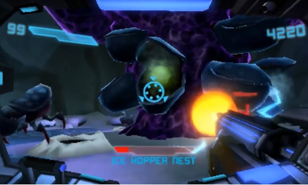 Man kan även använda den analoga spaken för att vända sig om. Styrschemat är så omodernt att jag inte har varit med om det i ett konsolspel sedan Nintendo 64.s dagar, där man också kunde använda spaken dels till att gå framåt och bakåt med, men också till att rotera i sidled med. Möjligheten att röra sig i sidled (att ”strafa”) finns inte, såvida man inte låser på en fiende med L (och därefter rör sig runt denne) eller håller inne R för att titta fritt genom att vrida och vända på hela konsolen, och sedan kan använda spaken helt och hållet för att gå framåt, bakåt och i sidled, men å andra sidan inte kan titta åt vilket håll som helst utan att vända på hela konsolen (en omöjlighet om man inte står upp och har fritt svängrum, och jag föredrar trots allt att sitta ner och spela). Dessa begränsningar leder till en del strul, inte minst vid intensiva bossfighter eller när man rör sig på små ytor. Man kanske till exempel endast vill vända på sig, men råkar gå lite framåt eller bakåt och ramlar ner för en platå. Dessutom vill jag vara fräck nog att hävda att den analoga platta styrspaken (eller snarare styrplattan) på 3DS är bland de sämre som finns när det gäller FPS. Tummen blir lite trött av det dåliga greppet man får och känsligheten är inte riktigt densamma som hos analoga spakar till andra konsoler.