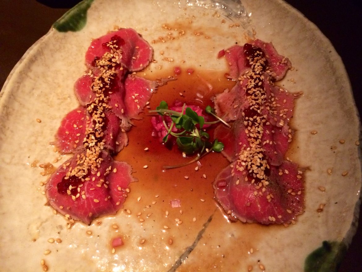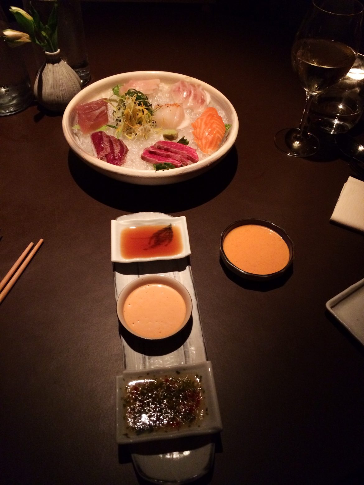 Vårt val av förrätt landar på en halv tallrik sashimi bestående av 8 bitar rå fisk utifrån kockens egna val. Men istället för en halv tallrik så blir vi serverade en hel, dvs 21 bitar. Kocken hade missförstått och därför blir vi nu bjudna på hela tallriken. Detta visar sig vara en trevlig överraskning – för även om delar av sällskapet inte är speciellt förtjusta i rå fisk – så måste vi erkänna att denna delikatess tillsammans med de 4 utsökta såserna: fisksås med korriander och lime, chillimajonäs, ponzu och kimchimajonäs hade gav en sagolik touch i munnen. Fiskbitarna var oerhört möra och gifte sig fantastiskt med såserna.
