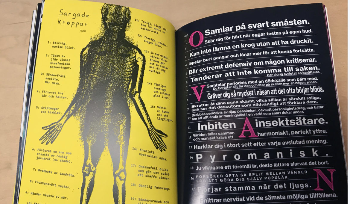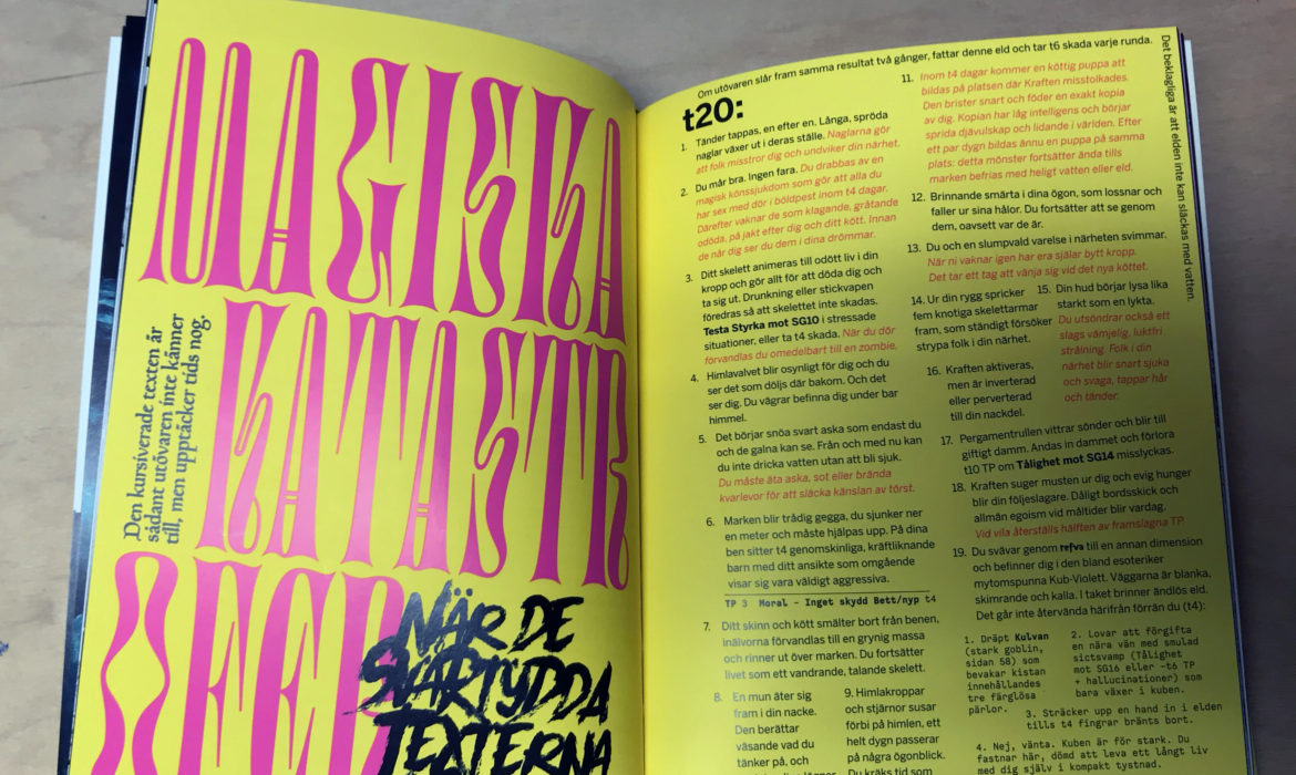Även om inte är så många regler så är det här ändå inte ett lätt nybörjarspel, utan det bygger på att du har lite erfarenhet av rollspel för att verkligen uppskatta Mörk Borg fullt ut och från början. Du kan givetvis välja detta som ditt allra första spel, men förbered dig då på att du kommer att behöva googla en hel del. Den grafiska designen i boken är gjord lite som om det skulle vara en bok med besvärjelser – olika typsnitt där allt är snett och vint. Det är ett coolt design-tänk, men när jag ville fokusera på att lära mig reglerna så blev jag distraherad.