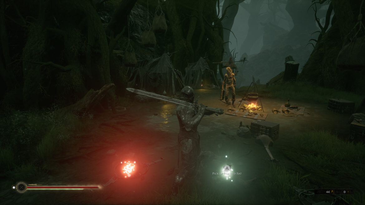 Sen tystnade skratten tyvärr för när de väl nådde fram till min rustnings-beklädda krigare så slog de ihjäl honom med ett par slag. Mitt odöda jag flyger ur kroppen och de ger sig helt sonika på honom istället och dödar honom med ett slag… Respawnar i början av banan och måste gå igenom allt en gång till. Samma resultat, går åt ett annat håll. En ännu större fuling slår ihjäl mig. Tillbaks igen. Ja, detta är som ni hör ett i raden From Software / Dark Souls-inspirerade spel.