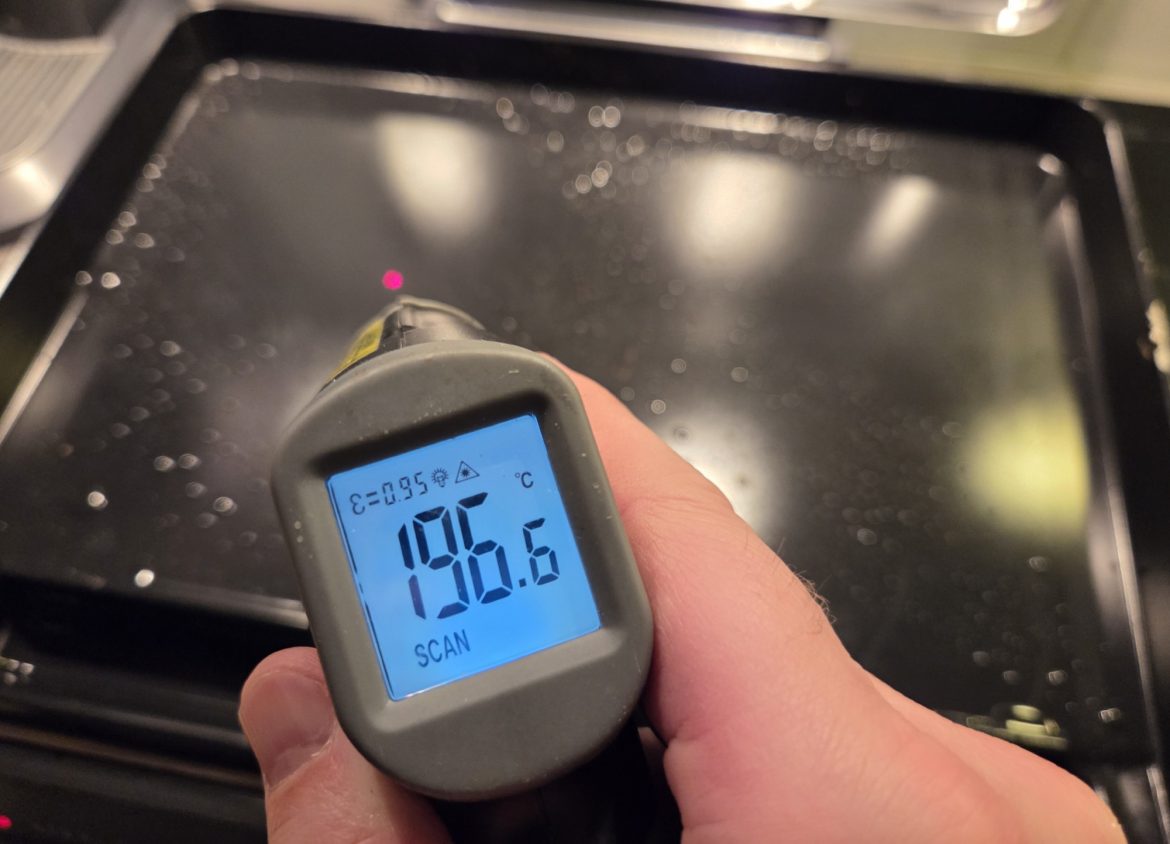 Själva funktionerna hos Sizzle är det inte så mycket att orda om. Den kommer med två varianter, ett stekbord och ett grillbord. Dessa placerar du på basenheten som sedan värmer upp dem till önskad temperatur. Det lite tunnare stekbordet ska förvärmas i sju minuter och det lite tjockare grillbordet i tio. Sedan är det bara att sätta igång. Till din hjälp har du en temperaturinstruktion klistrad på maskinen som ger dig riktmedel för vilken temperatur du bör använda till respektive råvara. Givetvis är dessa bara riktlinjer men det är inte så dumt att få en idé om hur långt du ska vrida knoppen på framsidan, vilken också är den enda kontrollmekanism som finns på Sizzle. Kommer den upp i önskad temperatur? Vi ställde in 200 grader och tog fram lasermätaren och 196 grader är nära nog.