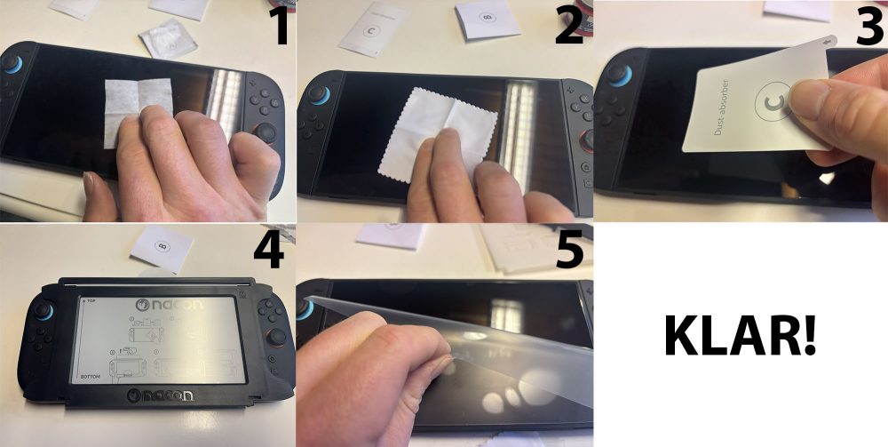 Det är ypperligt lätt att montera det på din Switch, det gäller bara att följa de tydliga instruktionerna. Allt är uppmärkt i vilken ordning du ska använda det och applikatorn hjälper till att montera skyddet på helt rätt sätt. Var noga med att använda spriten för att få bort alla fingeravtryck och trasan för att få bort allt damm för minsta lilla dammkorn ser så trist ut under skyddet.