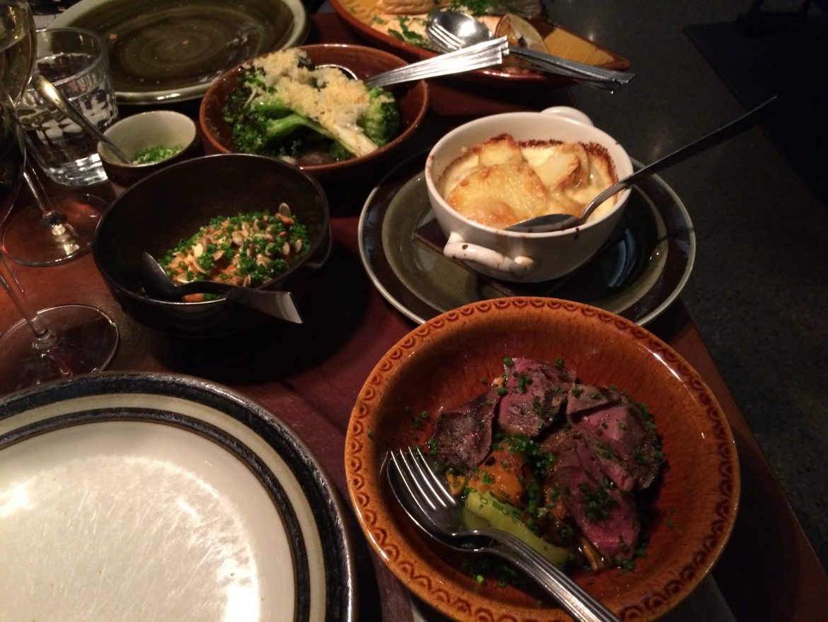 Efter rekommendation från vår servitör bestämmer vi oss för att prova Vildand från Ornö (som på allvar varnar för att den kan innehålla hagel), grillat bröst & ragu på låret med pumpa & ingefärssyltade trattkantareller (215 kr) samt ungsgrillad röding från Piteå (170 kr). Som tillbehör väljer vi grillad broccoli med lökvinaigrette & rostad, riven Duraost (50 kr), pumpastomp med inlagd pumpa & rostad vitlök, jordärtskocksgratäng med västerbottenost (60 kr) och rökt majonäs (25 kr). När vi är på väg att beställa fler tillbehör så stoppar servitören oss och säger att vi kommer bli mätta av det vi redan beställt.