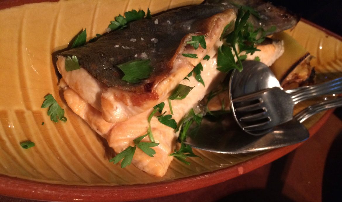 Till rödingen från Piteå föreslås ett vitt Riesling med namnet C.A.I, friskt och fräscht. Fisken har en fin konsistens och är smörig och ren i smaken. När det gäller tillbehören så var vi mest förstjusta i pumpan och den grillade broccolin. Jordärtskockan med västerbottenost kändes lite underlagad och smakade lite som rå potatis.