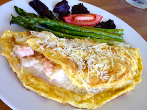 Låt omeletten stelna och låt den sedan glida ned på en tallrik med stekt sida nedåt, häll i ytterligare en klick smör i stekpannan och vänd tallriken så att omeletten faller tillbaka ned i pannan med den ostekta sidan nedåt så att den med får färg. Häll i hälften av räkröran och vik omeletten dubbel. Låt den glida ned på en tallrik och strö över lite parmesanost