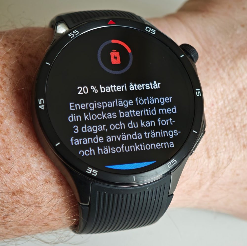 Den här smarta lösningen med dubbla chipsets märks verkligen i batteritiden. Ett av de största problemen med Wear OS-klockor överlag har varit att man får en batteritid på 1–3 dagar. Här är det inga som helst problem att komma upp i betydligt mer. Under tiden vi har testat klockan har vi i snitt laddat efter 3–5 dagar. Använder vi funktioner som träning med GPS-spårning riktigt mycket klarar vi oss i cirka 3 dagar innan laddning, och vid normal användning är 4–5 dagar inga problem.