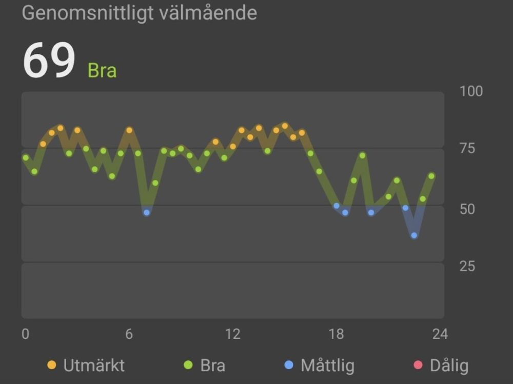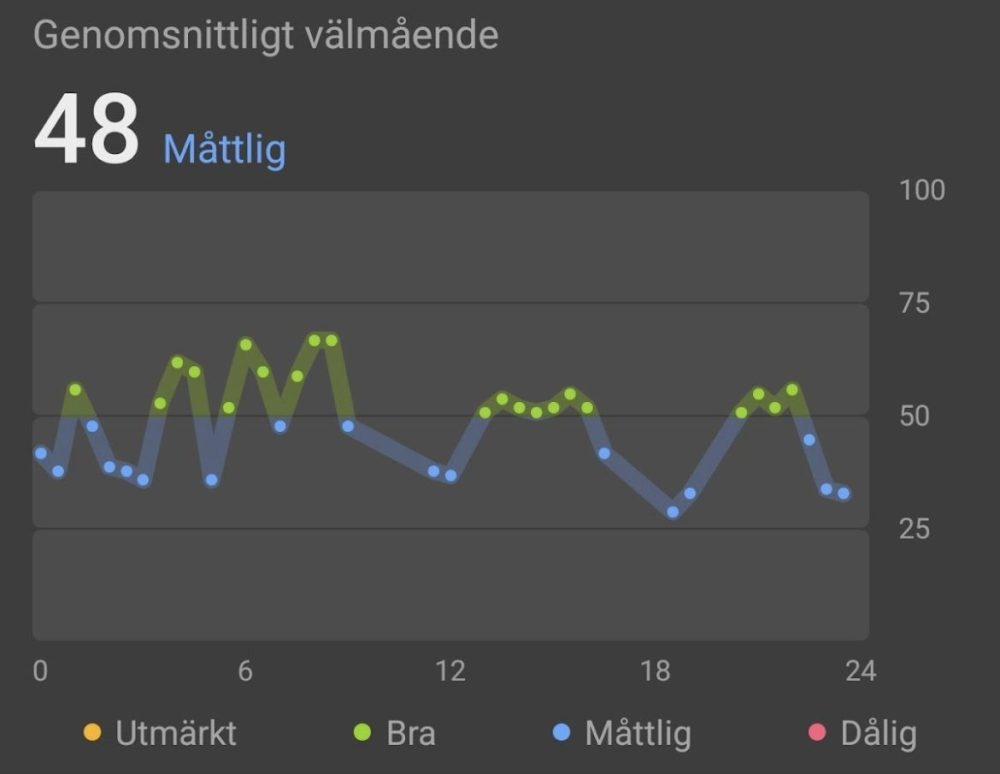 För den mentala balansen finns ”Välmående”-funktionen, som använder data som pulsvariabilitet (HRV) för att analysera stressnivåer och kan erbjuda guidade andningsövningar för att hjälpa dig slappna av. Och det fungerar faktiskt rätt bra, om man kollar på bilderna ovan så är det rätt stor skillnad på en stressig jobbdag, vs en ledig dag.