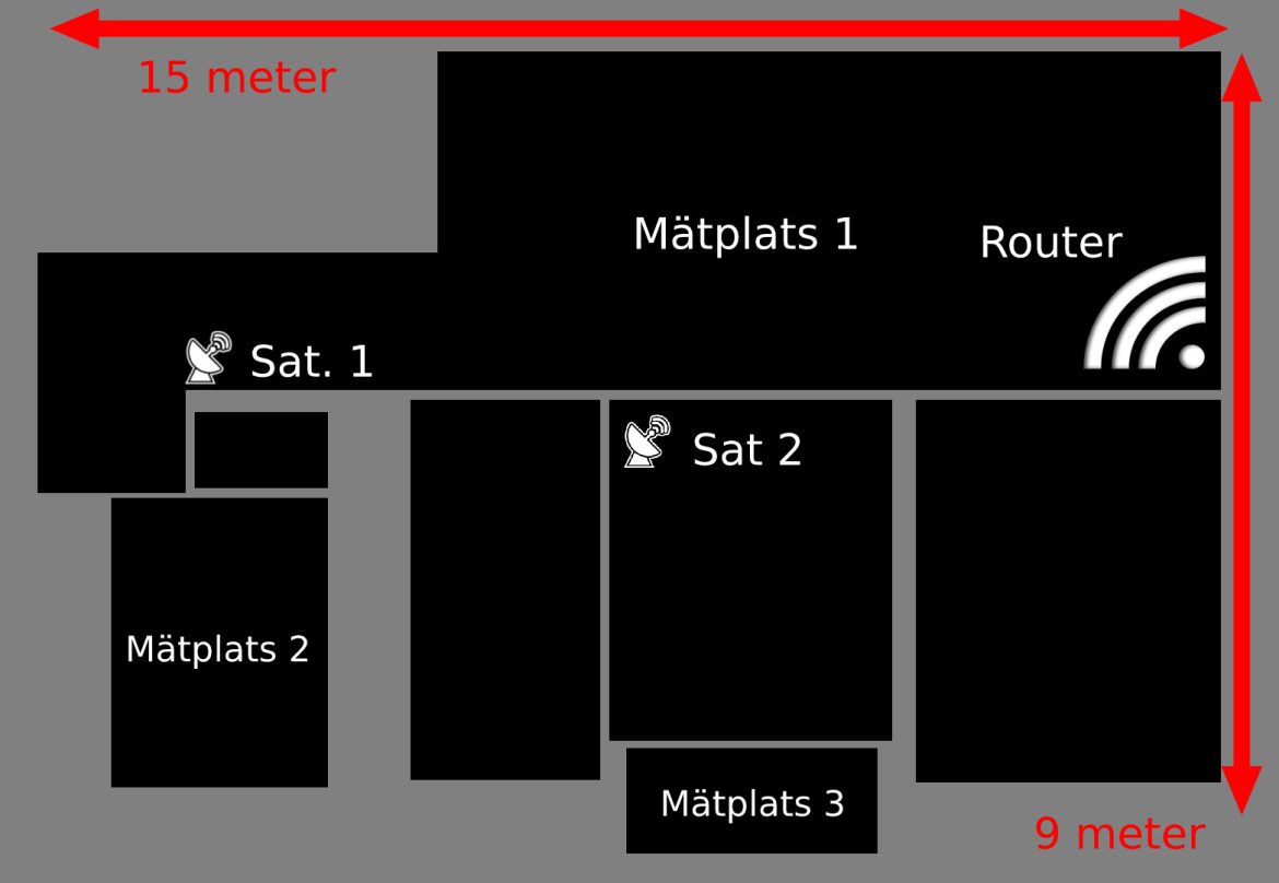 Vi inledde med att mäta signalstyrkan på de tre mätplatserna utan satelliterna inkopplade och gjorde sedan samma mätning med alla satelliter aktiverade. Nedan kan ni se resultatet. Vi presenterar signalstyrkan i dBm (decibel milliwatt) vilket enkelt kan förklaras som det absoluta värdet av en signals effekt. Ju lägre minusvärde, desto starkare signal.