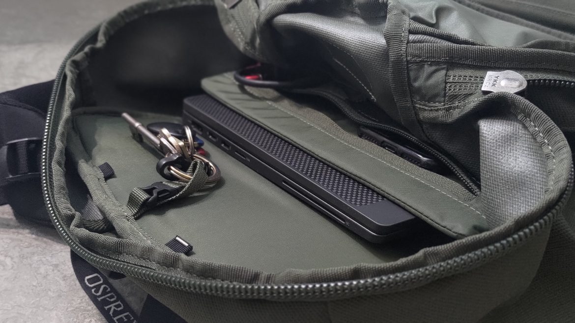 En större innerficka samt två mindre finns för att organisera småsaker. Ett vadderat fack för din laptop (upp till 16”) finns på insidan – som vid behov också kan användas för Ospreys camelback-system kallat Hydraulics. Strax ovanför laptopfacket kan du hänga dina nycklar och med samma krok hänger du upp din vattensäck.