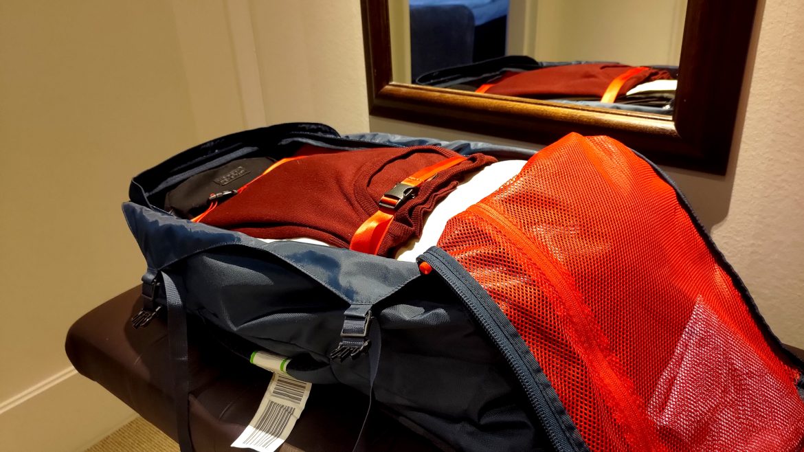 Ryggsäckens lock är i stort sett bara tyg, vilket visserligen drar ned vikten på väskan, men gör att du måste vara försiktig med hur du packar och vad du lägger var. En vinflaska högst upp är tveklöst riskabelt, men rullar du in den i exempelvis en handduk och låter den vara närmast ryggsäckens rygg så ligger den hyfsat tryggt. Avsaknaden av hjul och dragvariant, som även det drar ner vikten, gör att du konstant måste bära den. Men det är också ett av säljargumenten så det blir svårt att faktiskt notera det som en svag egenskap. Du måste som köpare helt enkelt vara med på den premissen.
