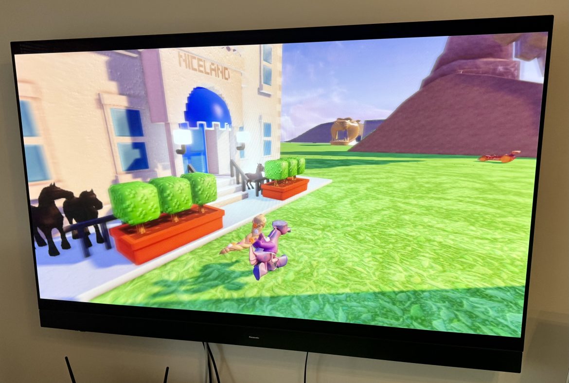Om vi för omväxlings skull börjar ”nedifrån”, med material som är digitalt men inte Full HD eller 4K? Vi plockade fram trotjänaren Playstation 3 från vinden och drog igång Disney Infinity, som är färgrikt och använder ljus på ett snyggt sätt för sin tid. Närmar vi oss panelen skvallrar de stora pixlarna om spelets åldriga ursprung med 720p-upplösning och SDR-palett i färgerna, men i rörelse ser det hela förvånansvärt piggt och modernt ut. Uppdateringen är mjuk och återgivningen färgglad, trots inget stöd för VRR och HDR. Kontrasten och ljushanteringen återskapar effekten av solljus övertygande för ett system som snart har 20 år på nacken.