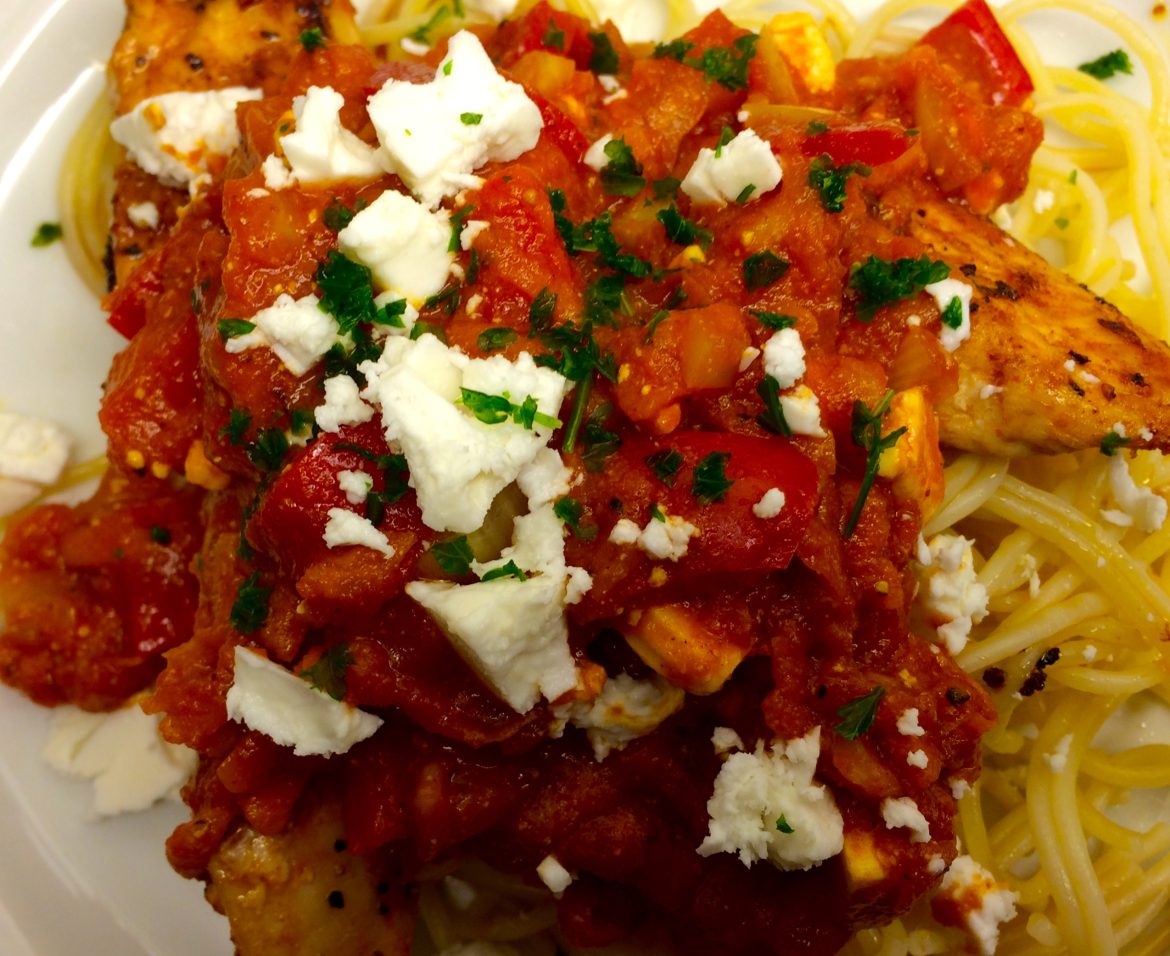 Hacka och stek upp ½ gul lök, 2 klyftor vitlök och en röd paprika. Blanda i en riven, stor morot och häll på ett paket krossade tomater. Salta och peppra och krydda rikligt med Findus frysta örtkryddor Provencale (blandning av Basilika, Oregano, Rosmarin, Timjan och Kyndel). Stänk i två matskedar från det kokande pastavattnet och rör om. Blanda i kycklingbitarna och servera med pastan. Toppa med smulad fetaost och persilja.