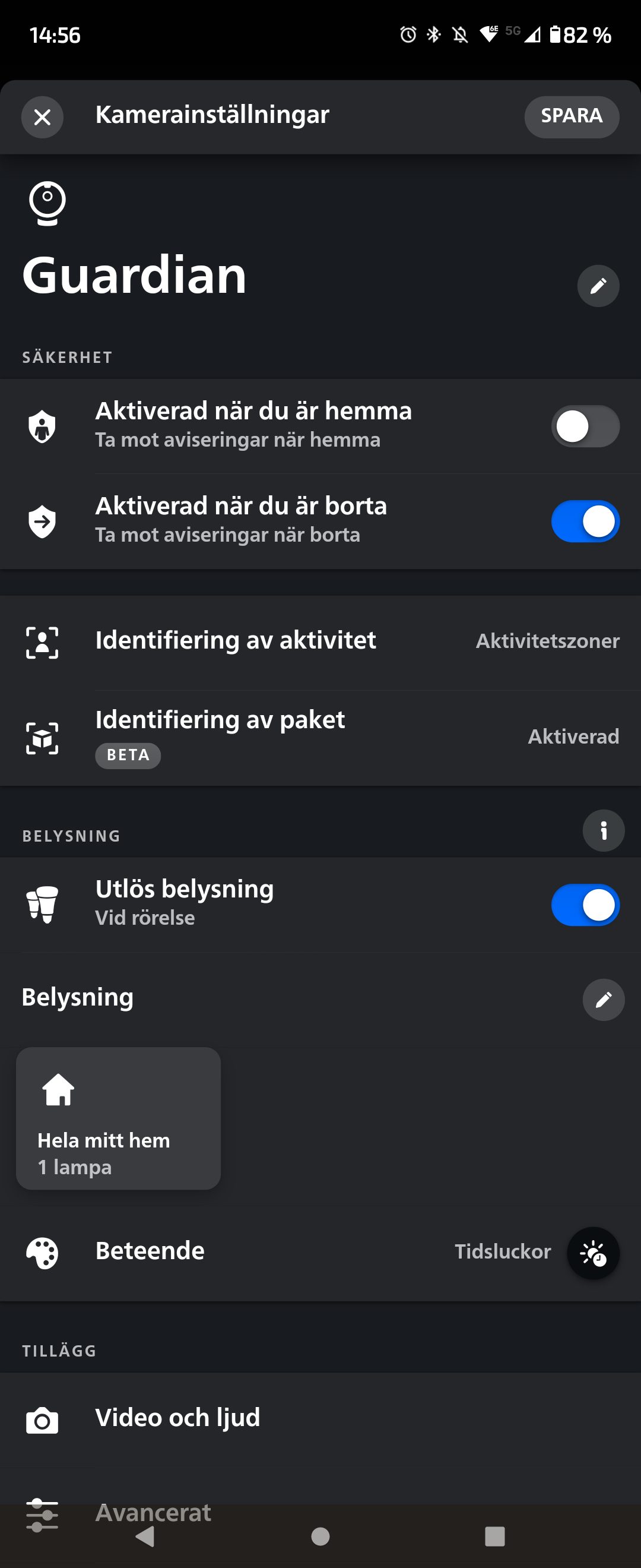 Aktivera åtgärd har två lägen, när du är hemma och hemifrån. Du definierar vad du vill ska hända i respektive läge när kameran registrerar rörelse. Är du inte hemma och något gör att du vill vidta en åtgärd är sannolikt ett bra alternativ att samtliga lampor blinkar rött och sirenen går igång. Det stora värdet blir att stressfaktorn för en inbrottstjuv ökar då hela hemmet börjar blinka rött. Kanske inte just på grund av blinkandet utan mera att grannar runt omkring kommer att vända på huvudet och fundera på vad som händer. Här bör man inte heller endast tänka punktbelysning inomhus. Även ljusslingor på balkonger och monterad utebelysning kan länkas vilka dessutom inte är speciellt enkla att koppla ur. Effektens tyngd vilar ju dock naturligtvis mot hur många lampor som är inkopplade mot systemet. Är du däremot hemma kanske din åtgärd ska vara att blinka vissa zoner eller lampor för att påvisa för en obehörig att dennes närvaro är uppmärksammad.