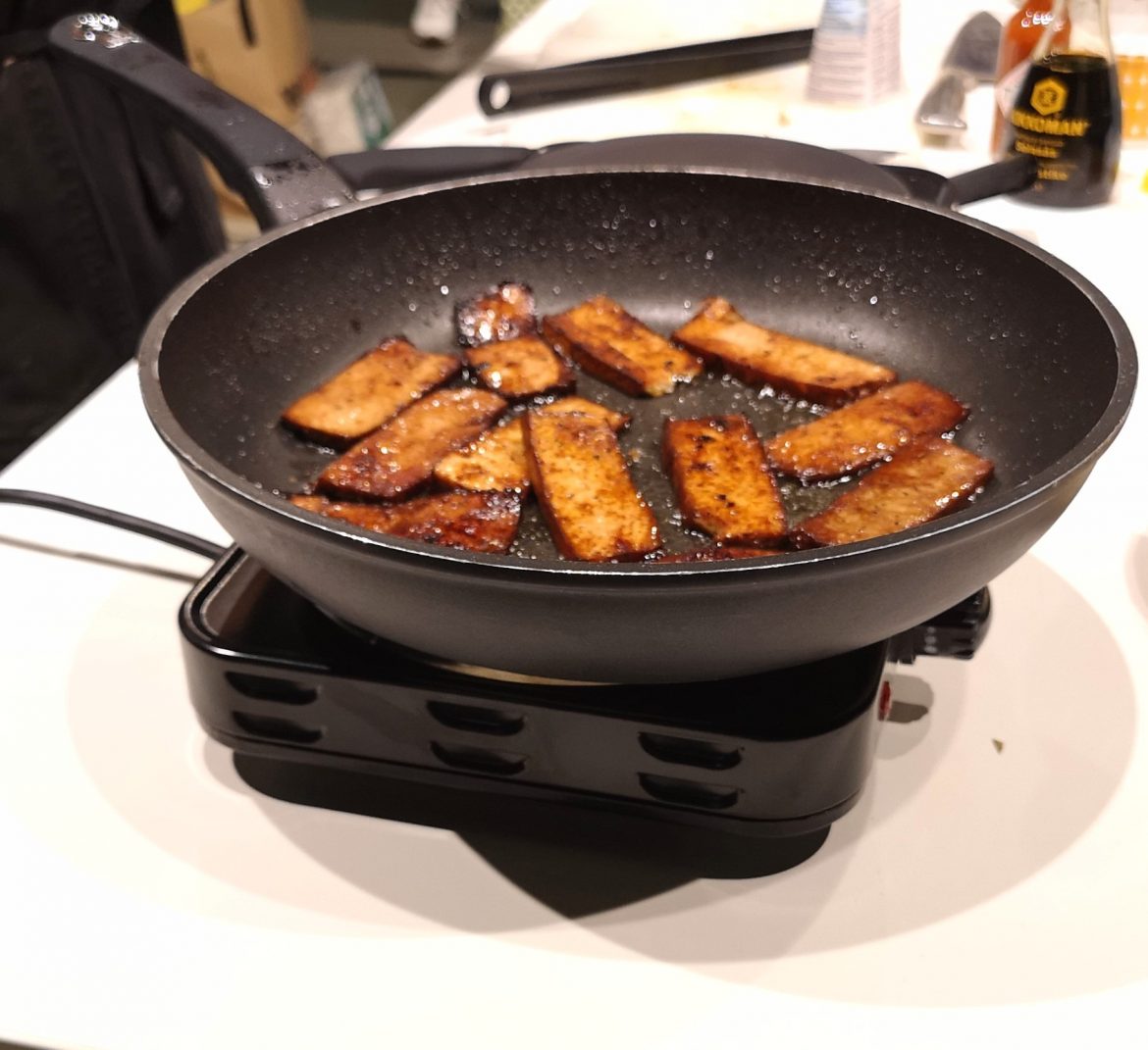 Jag hittade Gustav från JävligtGott, vars bok jag recenserade häromdagen. Han tillagade bacon och äggröra (utan ägg eller bacon). Hemligheten i äggröran fick jag lära mig är att använda svart salt (kala namak) som har en smak av svavel vilket gör äggsmaken i röran, som annars baseras på tofu. Baconet eller fejkonet, är tofu med soja och liquid smoke.