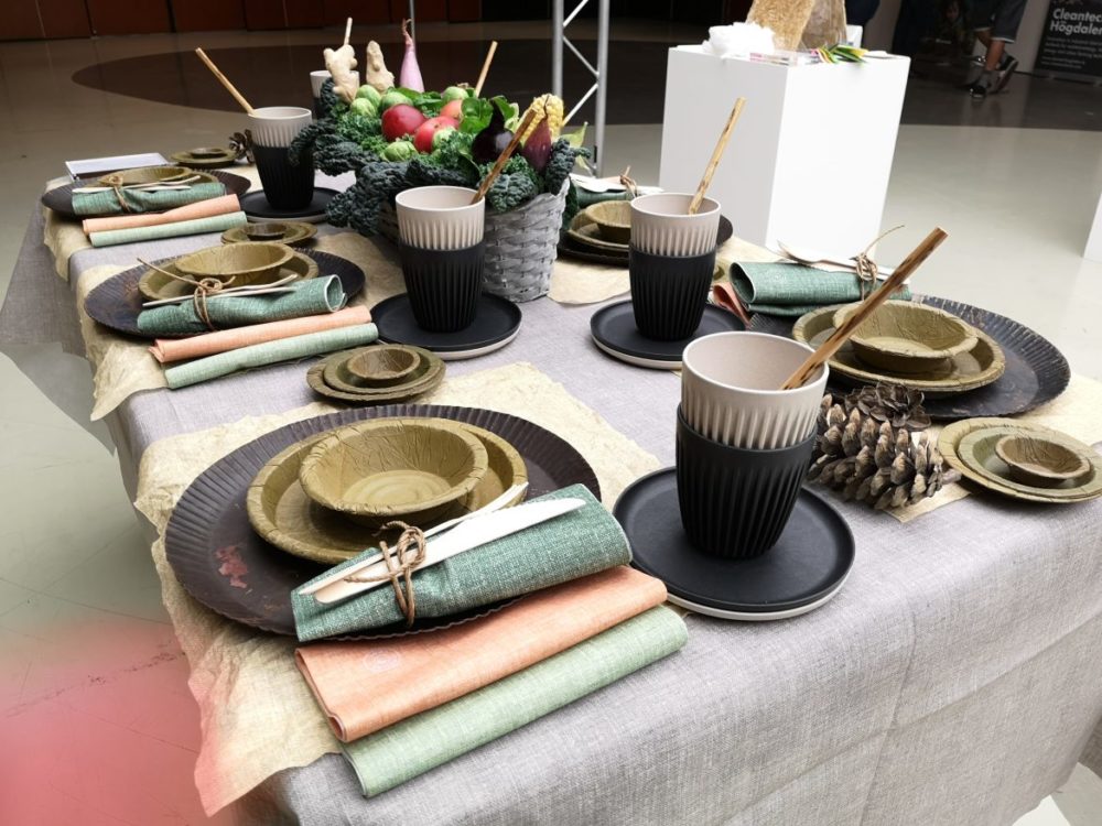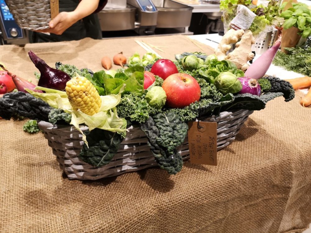 Årets mässa fokuserar mycket på framtidens mat, förnybara material och växtbaserade råvaror. Med allt ifrån tallrikar tillverkade av palmblad till bestick av bambu, svenskproducerade ärtbiffar och drycker gjorda på frukter från andrahandssorteringen. Jag fick även lära mig att blommor inte är särskilt miljövänliga att köpa. Därav bilden på en grönsakskorg där uppe.