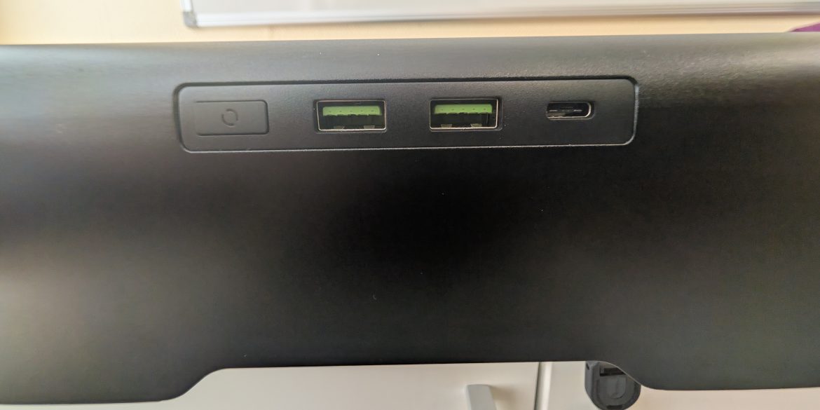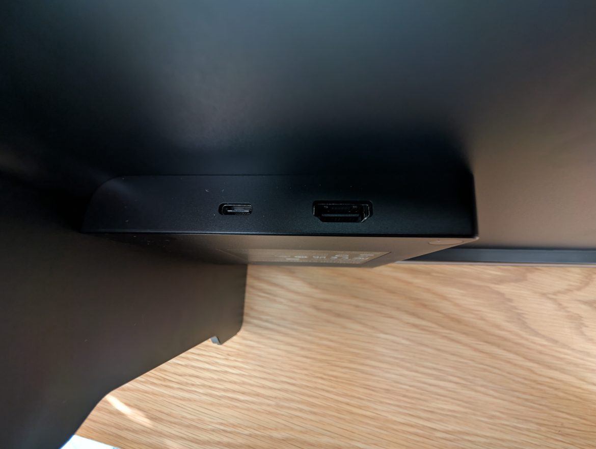 På höger sida hittar vi två USB-A-portar och en USB-C-port samt en mappningsbar funktionsknapp för olika belysningsscenarion. På baksidan finns en HDMI-port för bild och en USB-C-port för strömförsörjning.