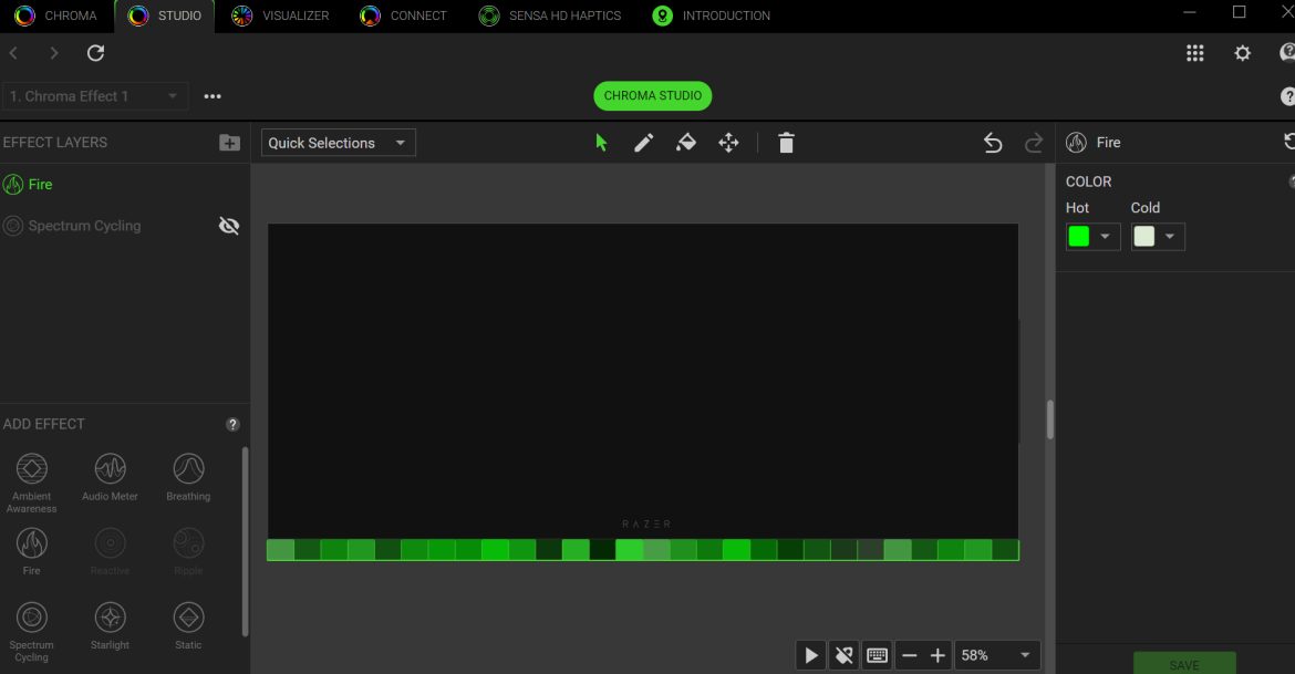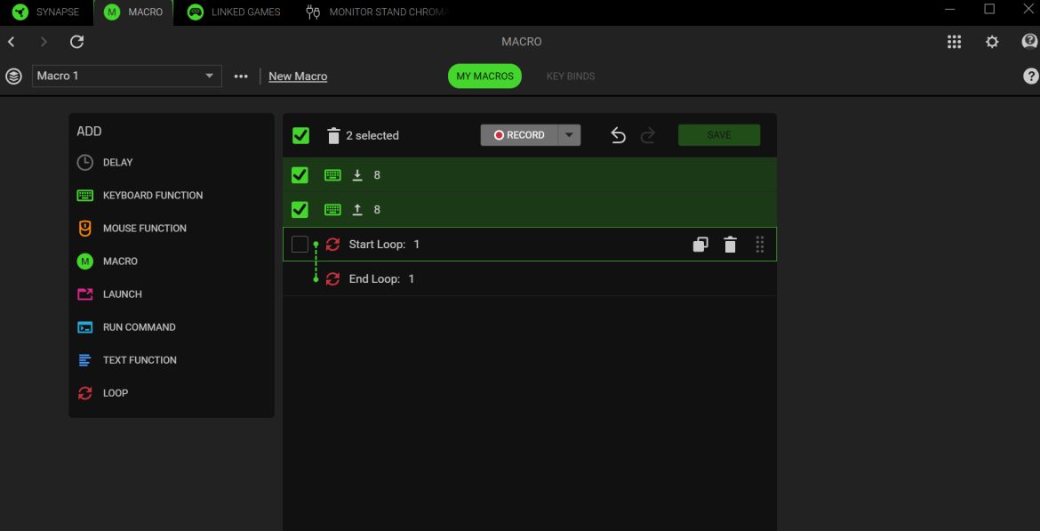 Som ni kanske minns nämnde jag den mappningsbara funktionsknappen ovan. Den kan användas med standardscenarion som är förprogrammerade, eller så kan du via Chroma-appen och Razer Synapse skapa egna scenarion kopplade till knappen. Dessutom kan du programmera egna makron för att styra vad RGB-belysningen ska göra – allt från olika knapptryckningar på tangentbordet till vilket belysningsscenario som startar med specifika program. Möjligheterna är nästan oändliga, och det är egentligen bara din fantasi som sätter gränserna.