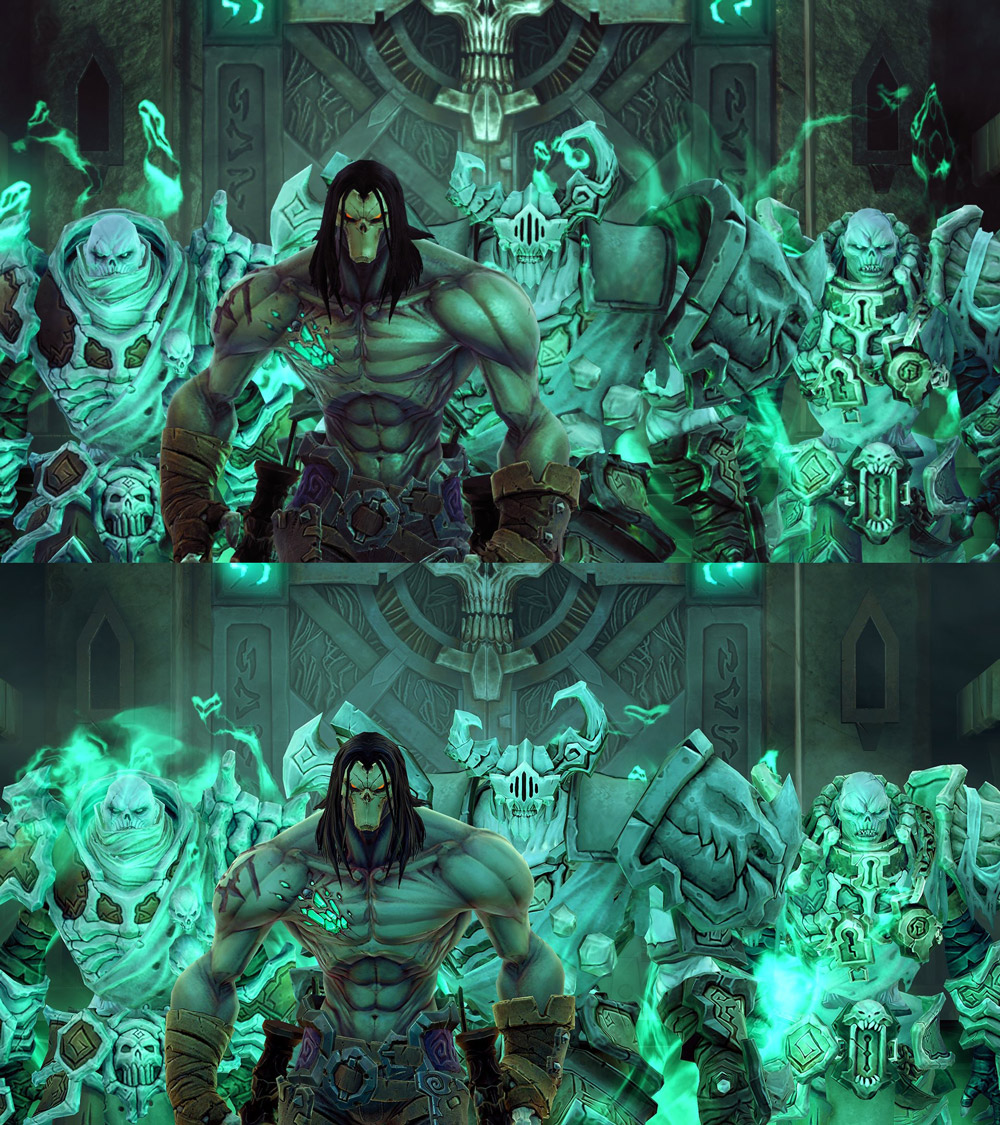 Utvecklarna Gunfire Games, som till stor del består av folk från Vigil Games – som alltså utvecklade originalen – är huvudmännen bakom denna remaster som fått det lustiga tillägget ”Deathinitive” edition. Huvudsakligen är det grafiken, i form av upplösning i 1080p (på både PS4 och Xbox One), nya texturer och framförallt nya ljussättningseffekter som står högst upp på menyn. Och visst, så här snyggt var Darksiders 2 aldrig på PS3 eller Xbox 360, samtidigt som vi ju faktiskt fick en lite snyggare (och, tack vare gamepad:en – smartare) version 2013 på Nintendos Wii U. Frame raten har låsts till 30 fps, förmodligen för att motverka telering, och det är beklagligt då Darksiders 2 lätt hade gått att köra i 60 fps, då det inte alls är lika avancerat som säg Nathan Drake Collection. Ändå har denna utgåva svårt att hålla jämn steg, även med 30 fps som mål, särskilt på Xbox One. PS4-versionen är – som i 99% av fallen – stabilare och klarar målet i de allra flesta fall, samtidigt som vi sett Darksiders 2 rulla perfekt i 60 fps på en numera blygsam PC. Visst, det är lite skarpare nu, men vi hade lätt bytt 1080p mot 720p om vi bara istället fick stadiga 60 fps, eftersom det gör så mycket för spelupplevelsen.