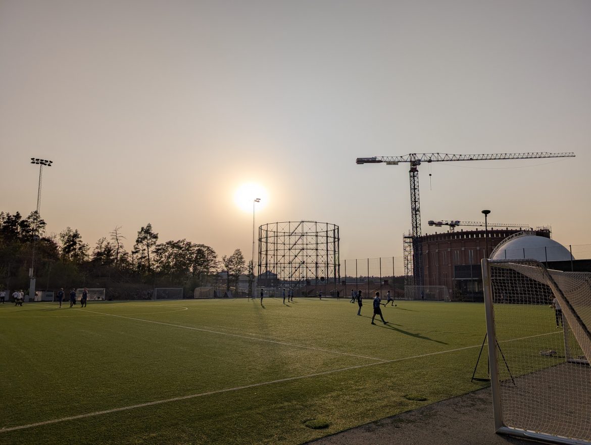 Det finns en funktion som kallas ’Förvandla’ som ger möjlighet att med hjälp av generativ AI ändra eller lägga till saker i bilden. Om vi tar den här bilden på en fotbollsplan i solnedgång: