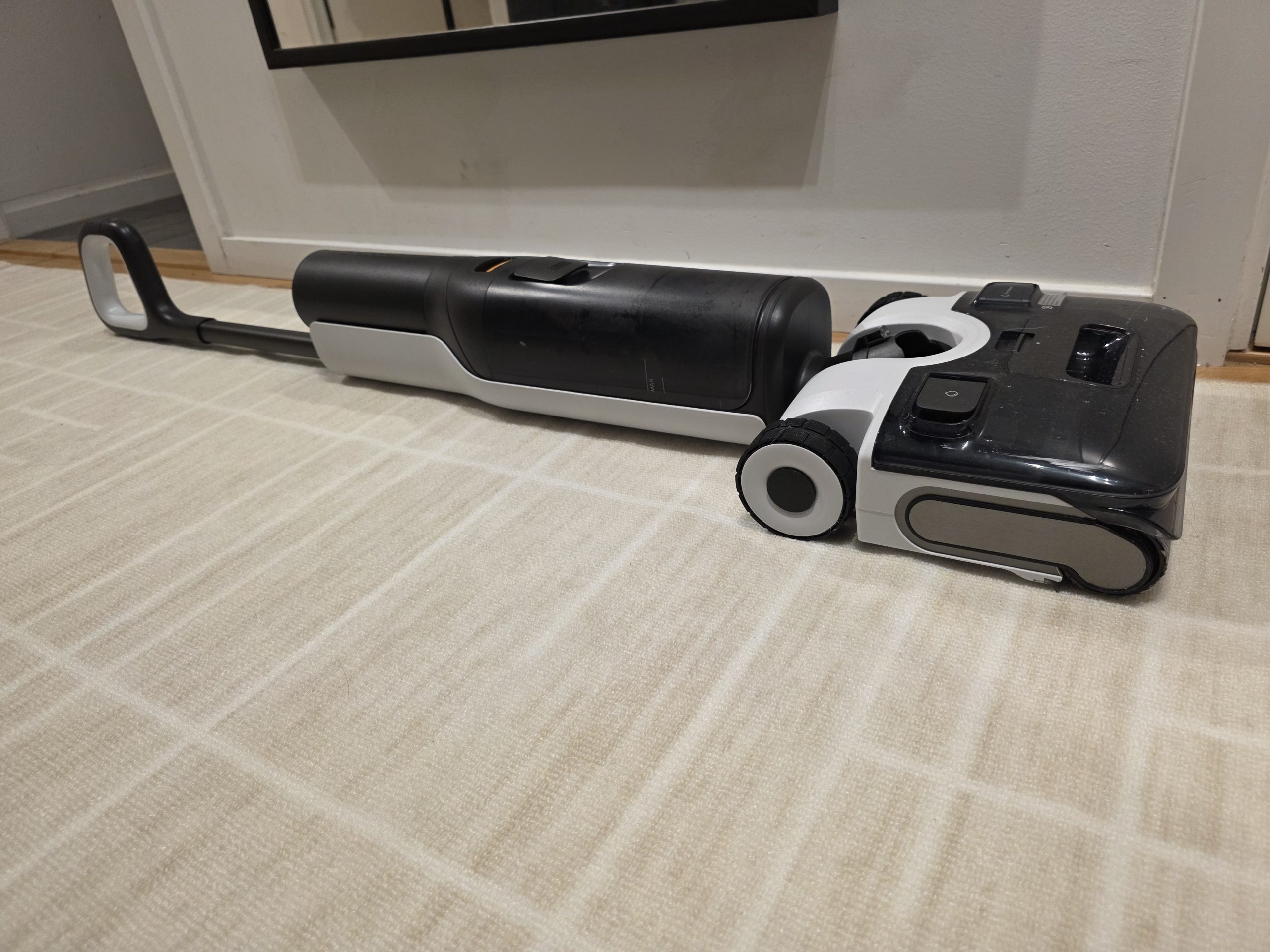 Något jag märkte är att lister och kanter inte riktigt blev rena. Jag fick köra över trösklar flera gånger och det blev bara mer blött utan att smutsen nära kanten sögs upp. Det krävs alltså lite extra precision vid lister och trösklar.