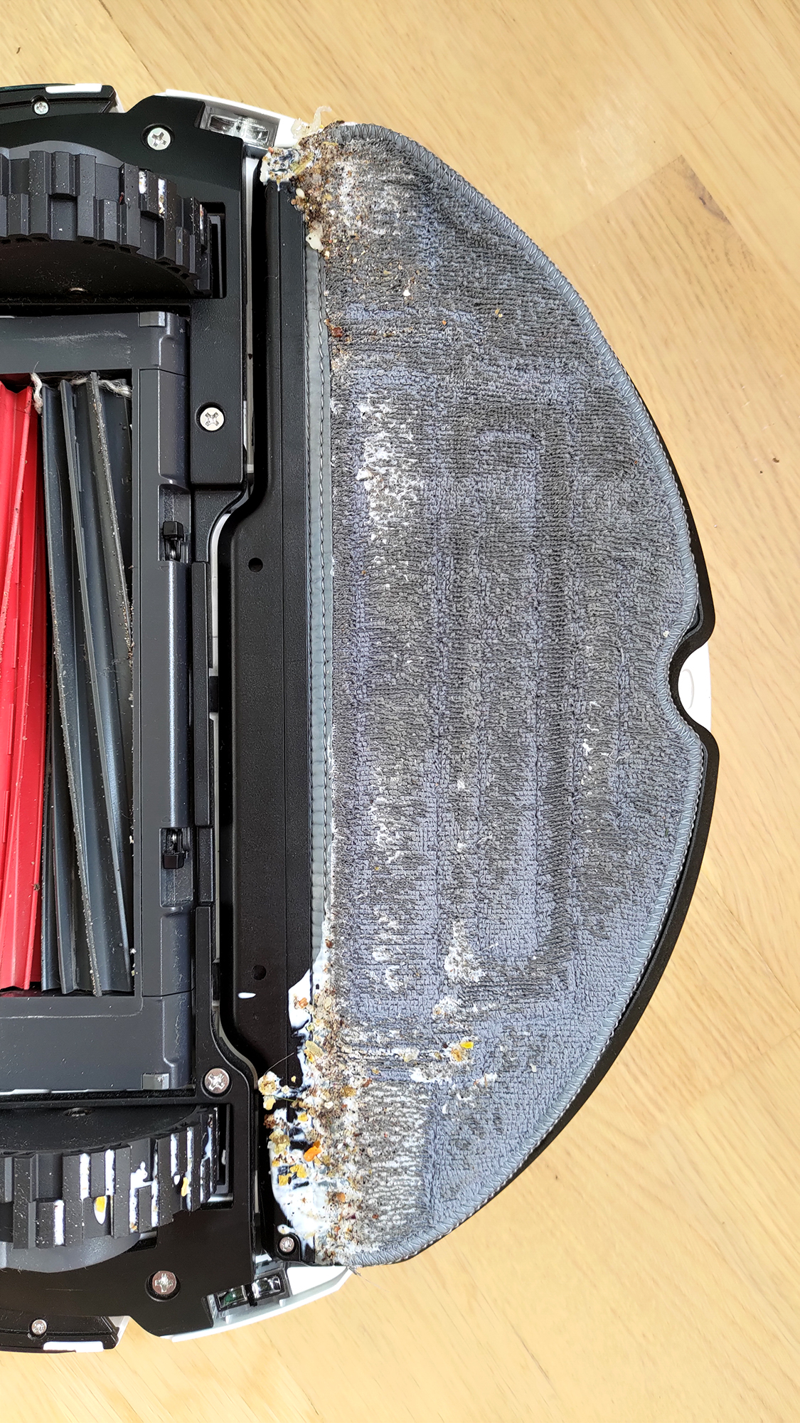 Vi förberedde en överdriven röra av fet vitlökssås, kaffepulver i kombination med damm och smulor. Roborock S8 Pro Ultra behövde tre passager för att helt få bort smörjan vilket är avgjort godkänt då detta är i överkant för vad som rekommenderas, men vi ville prova ändå. Vad vi lärde oss här var att be Roborock S8 Pro Ultra lyfta dammsugarborstarna första passagerna innan den börjar dammsuga, för det blev ganska kladdigt på borstarna. I efterhand kändes detta självklart då ingen av oss skulle gå på dessa fläckar med en dammsugare innan vi initialt torkat bort eller moppat denna röra.