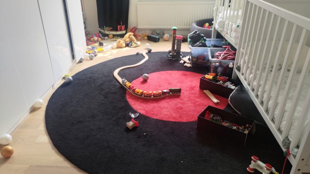 Vi fokuserade på ett rum och delade upp testet i tre nivåer. Vi börjar med Nivå 3; ”det värsta scenariot”. Röran är verklighetsbaserad och inget har gjorts för att förbereda en dammsugning. Sannolikt skulle ingen av oss dammsuga manuellt på denna nivå, även om vi gjort det på traditionellt sätt, så varför då testa detta? Därför att i vissa fall kanske 4 av 5 rum är undanplockade och det femte rummet, ja det får helt enkelt bli så bra det blir. Om Roborock S8 tar sig igenom hinderbanan utan att fastna finns möjligheten att skicka ut den ändå. Fyra av fem rum blir ju dammsugna och det femte, ja, så gott det går.
