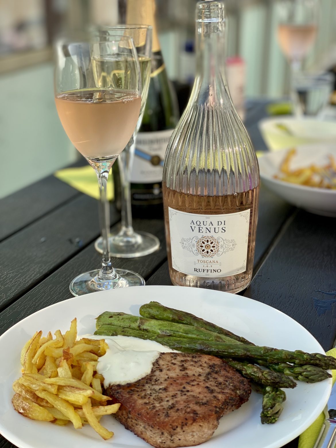 Blygsamt på ett angenämt sätt. Vacker, rosa färg, smakar sött men inte sliskigt. En kraftfull fiskrätt såsom halstrad tonfisk med tillbehör och en syrlig sås var perfekt till detta. Har en fin avrundning som lägger sig ovanpå maten på ett angenämt sätt, som en sidekick till huvudrollen. Här kan man njuta och skönja skillnaden på ett kvalitets-rosé och även konstatera att detta passar fint till efterrätter som glass också.