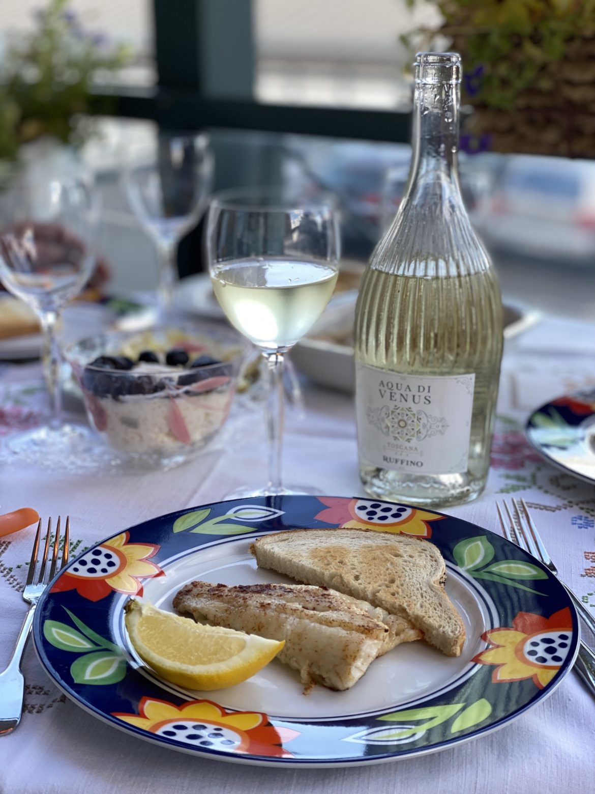 Vi tyckte att detta var ett friskt, fruktigt – men inte direkt sött – vin där citrusfrukterna känns direkt. Druvsorterna är 60% Vermentino, 20% Chardonnay och 20% Sangiovese. Här sker ingen lagring utan bara fermentering. Smak av tropiska frukter, citrus, lime och fikon. Äpplen och päron gav krispighet och en levande syra. Vi anade också toner av oregano. Med mat kommer rundheten fram, den stekta gösen matchade så fint med den krämiga räksåsen. Vinet blir mildare och ännu mer lättdrucket med mat. och detta kan du våga testa även med tyngre rätter, då det ökar mjukheten och tar fram mer av fruktsmaken. Eller varför inte para det med den svenska klassikern, färska räkor?