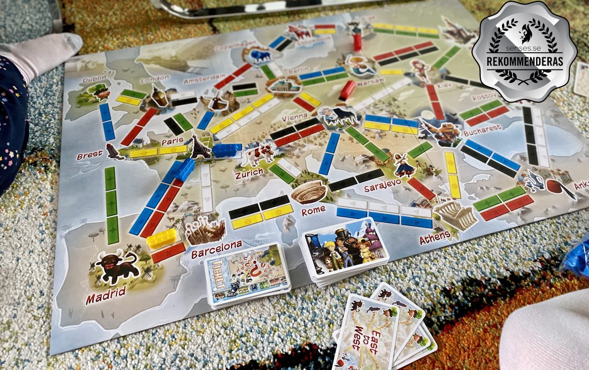 Ticket to ride-serien har blivit extremt poppis på senare år och denna version är den enklaste och mest nedskalade att börja med. Det känns lite som ett Monopol med rese-tema istället för hotell, det handlar i princip om att dra kort och lägga ut ”järnvägsspår” med plastlok mellan olika destinationer som är huvudstäder i (det större) Europa. Detta var uppskattat av alla, men det krävde en en hel del vägledning av vuxen även för en framåt sexåring (spelet rekommenderas från sex år), så vi skulle nog säga att man får ut som mest av det om man är aningen äldre eller i alla fall börjat grundskolan och har lite hum om geografi. Kul att spela och enkelt att lära sig, men blir för avancerat för de mindre barnen att spela själva. Detta blir då mer av ett familjespel än ett barnspel (vi drog gränsen för ”barnspel” vid rekommendationen 6 år). Betyg: 7