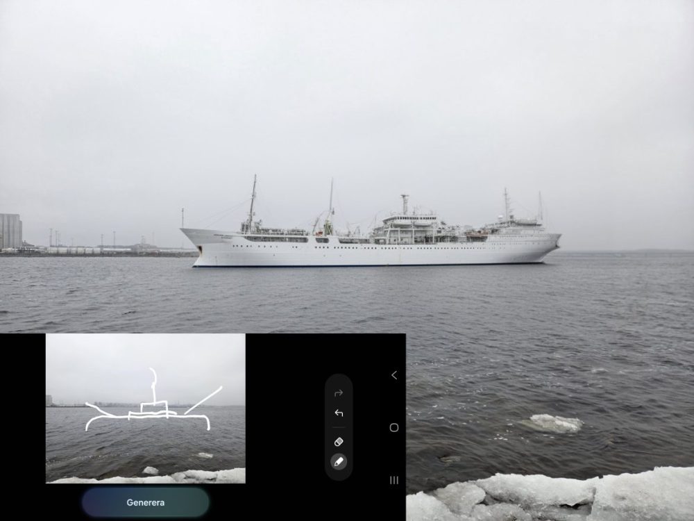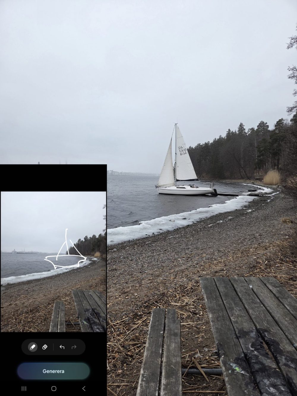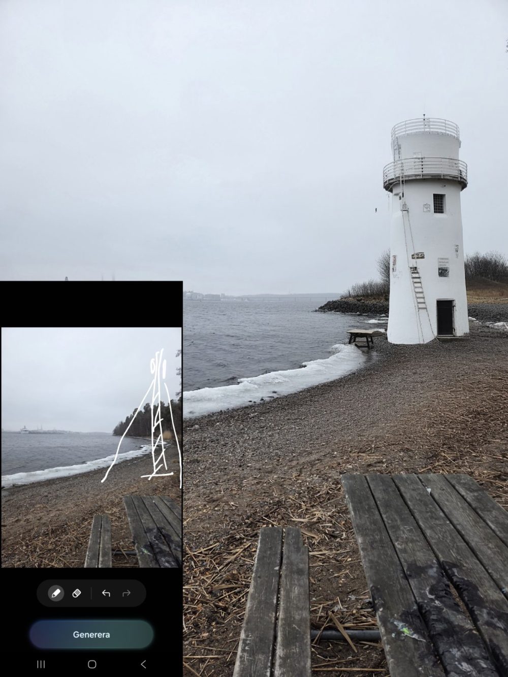 Starkt knutet till fotograferingen är ju givetvis AI-funktionerna. Det är läckert och underhållande. Precis som i testet med Samsung Galaxy Z Flip 6, där en inritad gås blir verklighet, fyllde vi på våra bilder med fyrar, fartyg och förtöjda segelbåtar. Men det blir lite av gimmick och något man efter ett tag inte använder speciellt mycket.