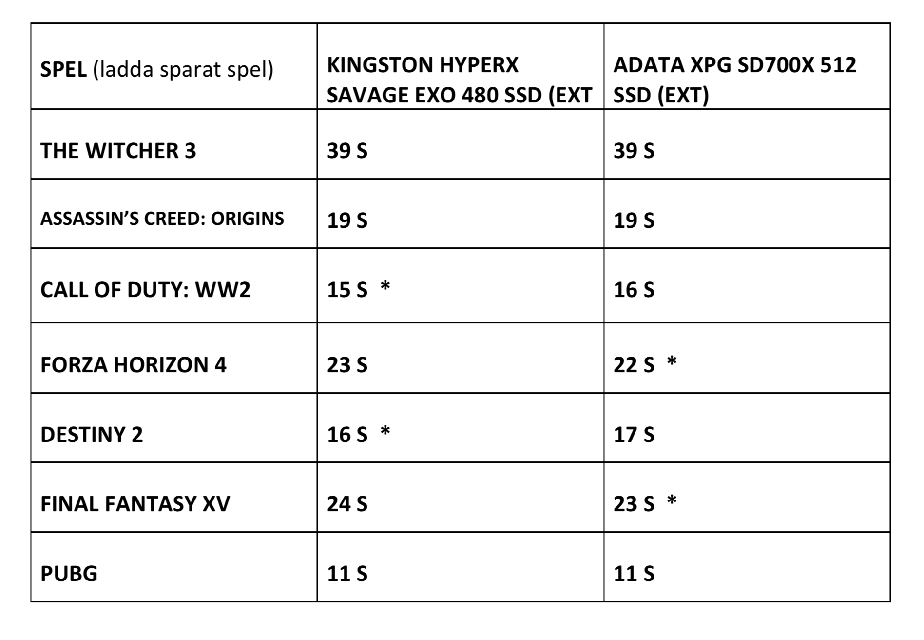 Benchmark-mätningar i alla ära, men riktigt intressant är att se hur disken faktiskt presterar i skarpt läge, under riktiga förhållanden. Vi körde samma uppsättning test av Xbox One X-spel som vi gjorde på ADATA, och publicerar jämförelsen nedan.