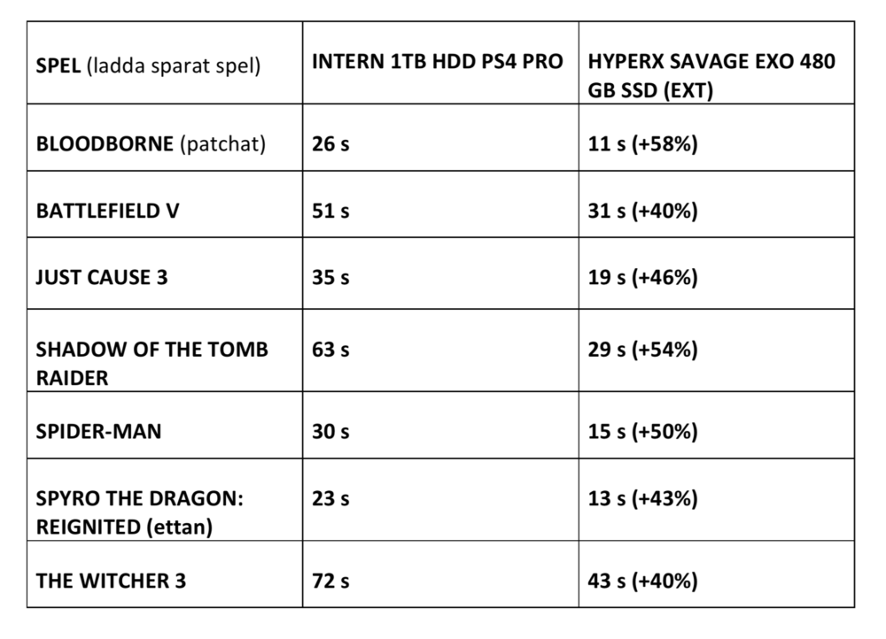 Återigen ser vi hur en SSD, som i detta fallet Savage Exo, i genomsnitt halverar laddningstider eller i alla fall förbättrar dessa kraftigt. Laddningstiderna med Savage Exo förkortas mellan 40-58% på PS4 Pro, vilket innebär en hel del mer spelade och en hel del mindre gloende på laddskärmar. Spelen laddar inte bara snabbare, resurser inuti spelen laddar också fortfarande och bjuder på en bättre och snyggare upplevelser i segladdade Open World-kolosser som Just Cause 3, The Witcher 3 och nyligen släppta Shadow of the Tomb Raider.