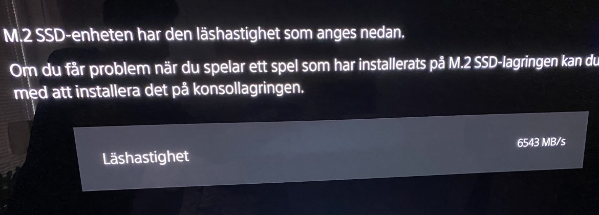 Firecuda 530 monteras enkelt in i din PS5:a och när vi startar upp den så erbjuder konsolen oss att formatera skivan och gör sen en egen mätning. Denna slutar på 6 543 MB/s, nästan 90% av den teoretiska maxhastigheten och en bra bit över den rekommenderade gränsen på 5 500 MB/s.