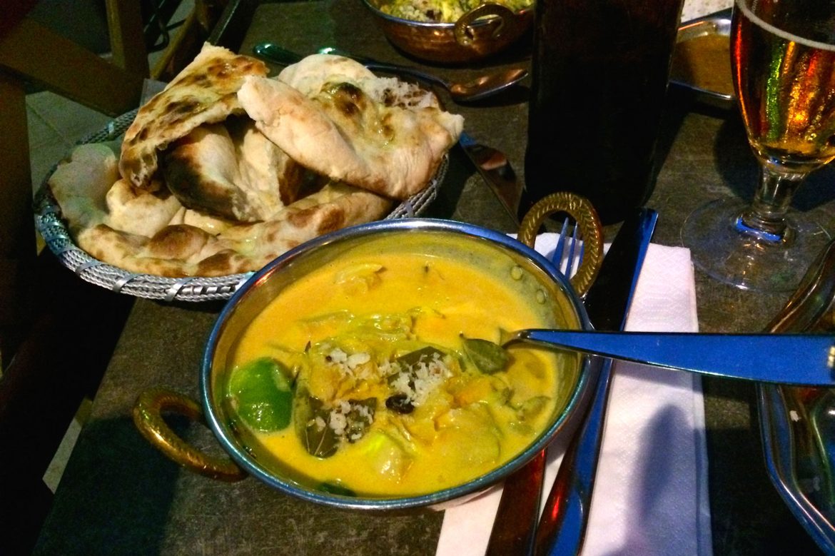 Efter ungefär femton minuter blir vi serverade var sin silverbricka med ris, sallad, mynta och mango chutney, linssoppa och raita (detta ingår i alla varmrätter). Så kommer våra respektive grytor in och det doftar ljuvligt.
