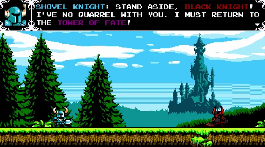 Shovel Knights resa tar sin början under bryska former. Shield Knight, Shovel Knights kompanjon och käresta, är försvunnen. Vår hjälte har gått ner sig och utan de båda förgrundsfigurerna har fältet och riket släppts fritt åt andra att ta över – och de har inte helt genomgoda avsikter. Shovel Knight är alltså som Batman i the Dark Knight Rises. En gammal hjälte som behöver rycka ut igen och göra sin plikt. Fast i en pixlad sagovärld. Och med spade och rustning istället för bataranger och batmobil. Och utan Michael Caine som Alfred, med dennes ständigt goda råd och visdomsord. Och utan Catwoman, och Robin, och… Ja, ni fattar.