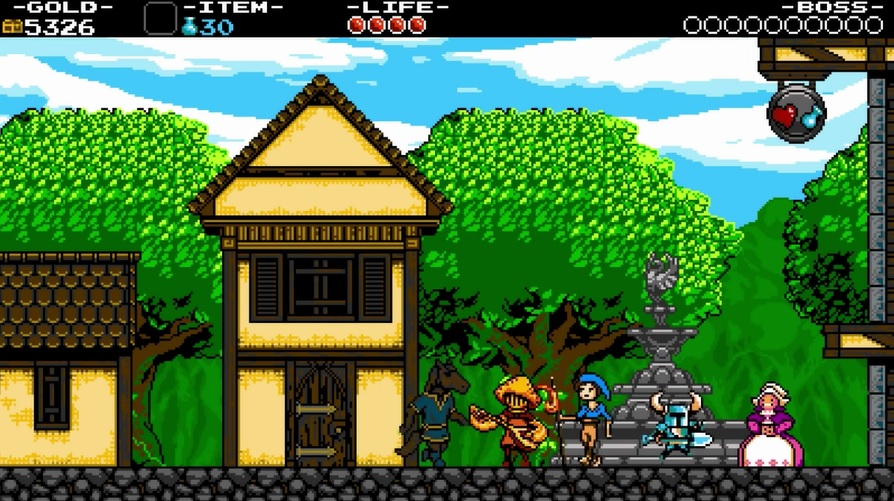 Just kristallkulorna är lite speciella och innovativa eftersom den som är duktig kan välja att krossa dem för att få ännu mer juveler och guld, eller att behålla dem intakta. Krossas de får man börja om från den senaste kristall som inte krossats på nivån, så det gäller att väga risk mot belöning. Guldet i spelet är också viktigt. Det mesta kan köpas för pengar i Shovel Knight, i de byar man besöker genom att resa runt på kartskärmen. Den som har spelat spel som Faxanadu, Battle of Olympus eller Zelda II (NES) känner nog igen sig i de sidoscrollande bymiljöerna. Här finns uppgraderingar som ger utökad livskraft och magimätare, nya rustningar, användbara magier (relics kallas de) och en del annat. Man behöver passa sig på nivåerna för att få behålla sitt guld, för varje gång man misslyckas förlorar man en ansenlig andel av det, vilket i och för sig inte är hela världen. Men vill man ta sig igenom äventyret utan att spela om nivåer (eller roliga minispel, som inte är fullt så roliga för femtioelfte gången) i jakten på färskt, nygrindat guld gäller det att ta det varligt.