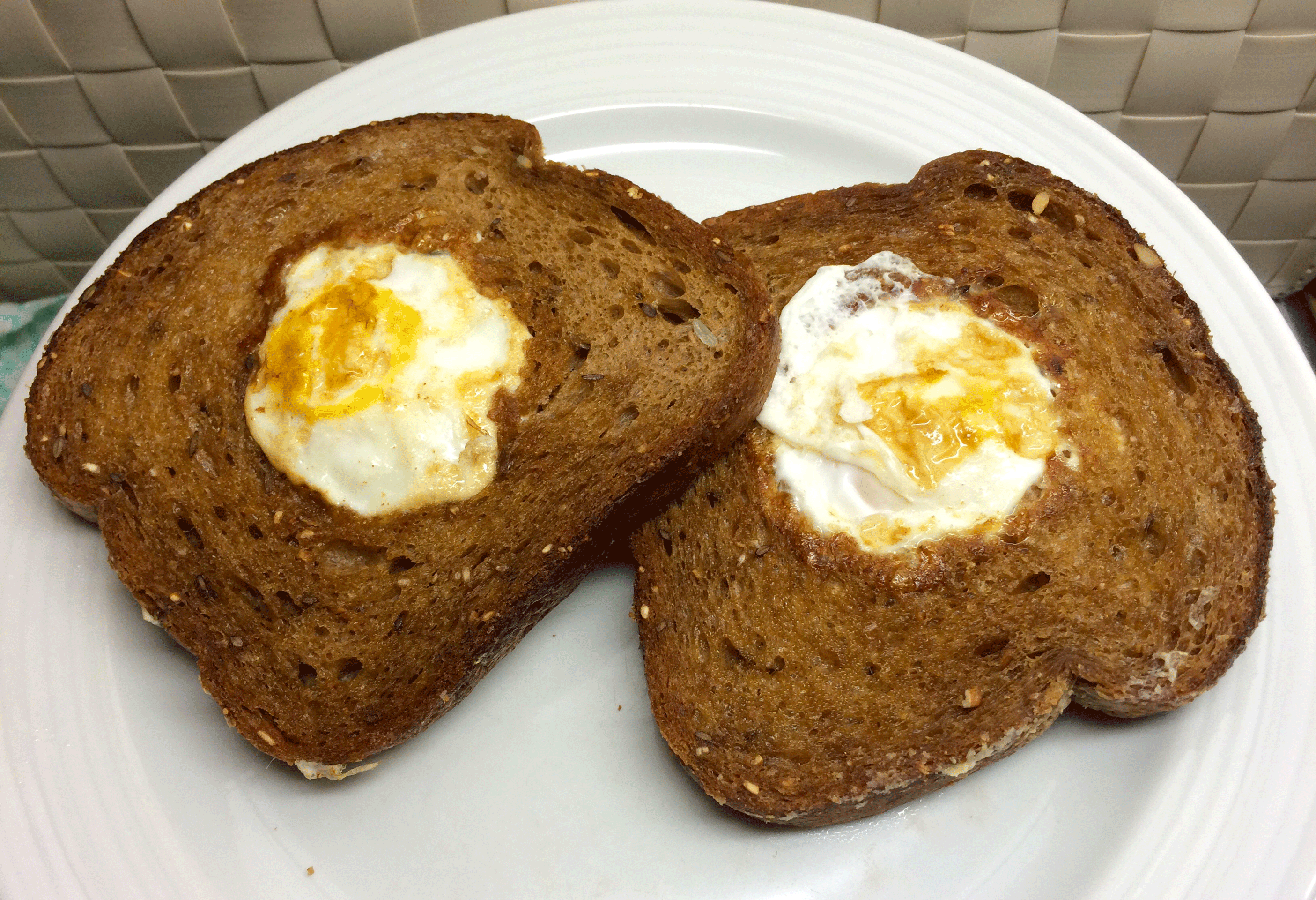 Stek upp en klick smör och placera brödskivorna i stekpannan. Knäck ett ägg och placera i hålet på varje brödskiva. Stek tills ägget blivit någorlunda fast och vänd brödet så att även andra sidan steks. När brödet blivit frasigt och ägget är färdigstekt så är morgonmackorna klara för servering. Vill man inte att ägget ska vara vändstekt så steker man bara ena brödsidan först och knäcker inte i ägget förrän det är dags att steka andra sidan.