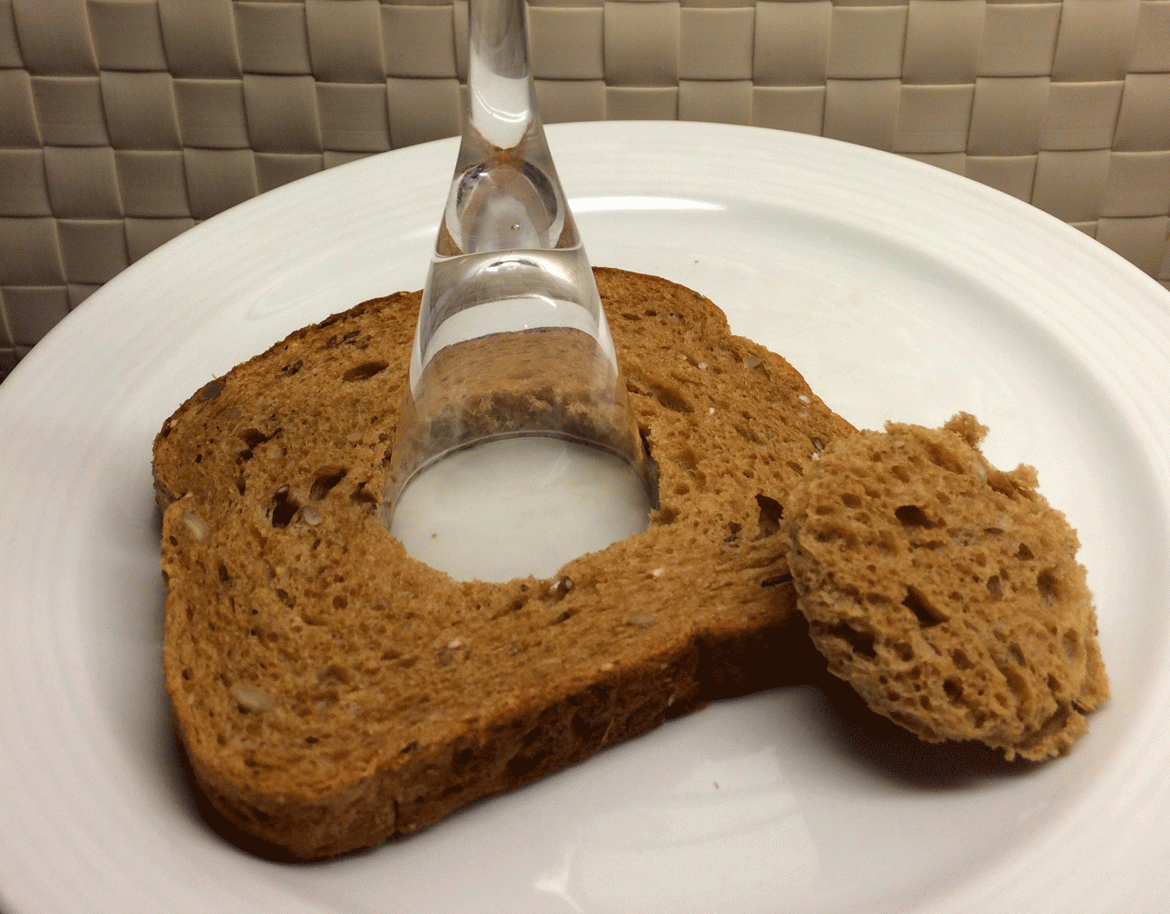 Ta önskat antal brödskivor. Gör ett hål i mitten på dem med hjälp av exempelvis ett snapsglas. Se bild!