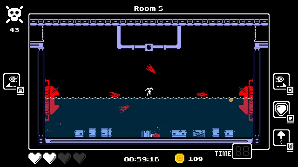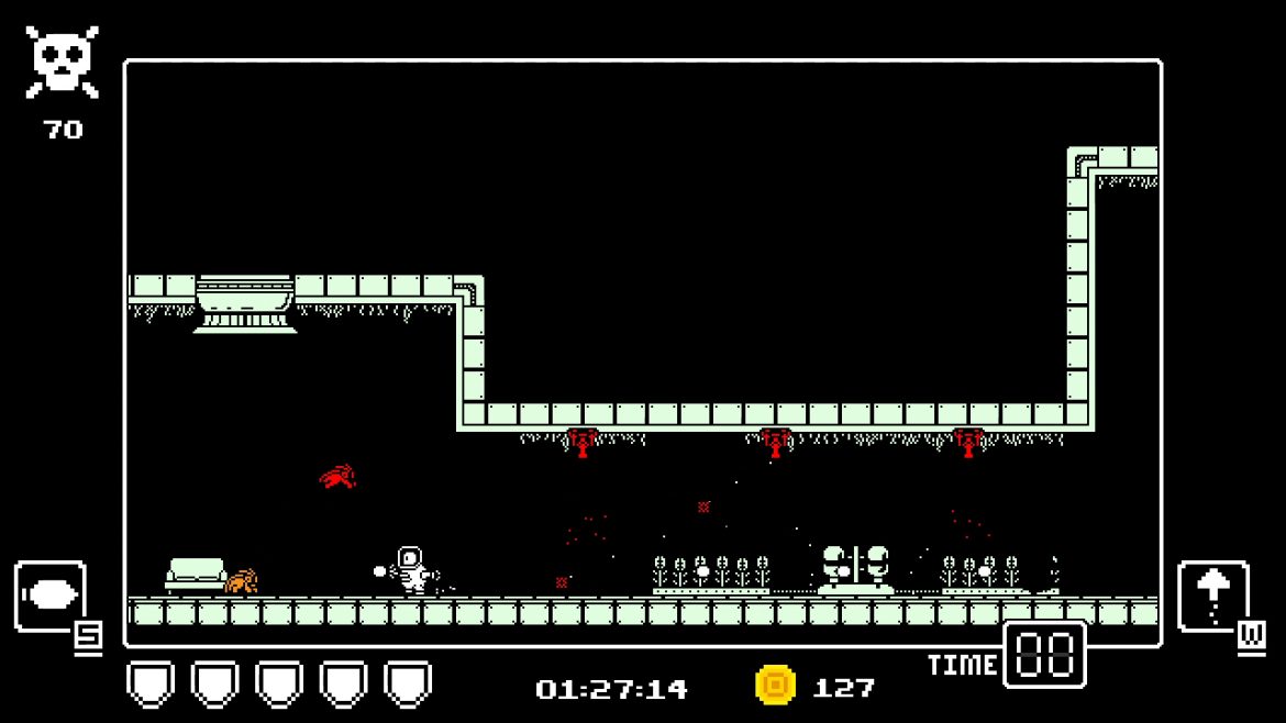 Grafiken är superenkel, men snyggt retro-inspirerad, hastigheten och animationerna känns moderna. Så det är en skön blandning av gammalt och nytt. Varje gång du dör tas du tillbaka till början och första rummet, så du måste ta dig igenom hela våningen på ett enda liv . och det är inte lätt kan jag säga.