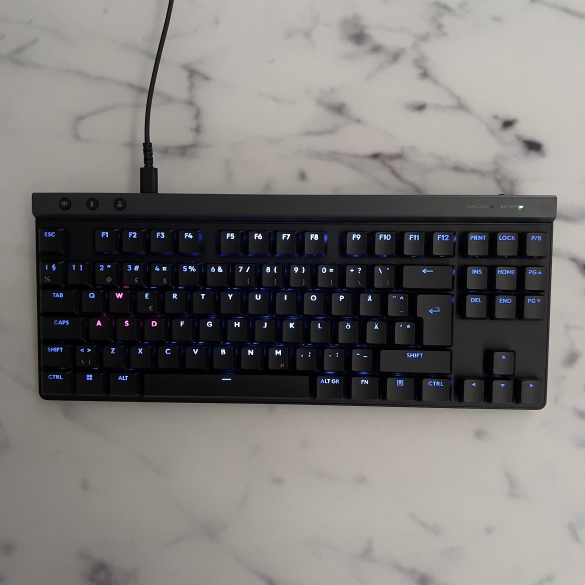På tangentbordets vänstra ovansida finns tre runda knappar som låter dig växla mellan tre olika anslutningsmetoder: Lightspeed dongle, Bluetooth eller kabel. På den högra ovansidan finns LED-indikatorer som visar om CAPS LOCK är aktiverat eller om batteriet behöver laddas.